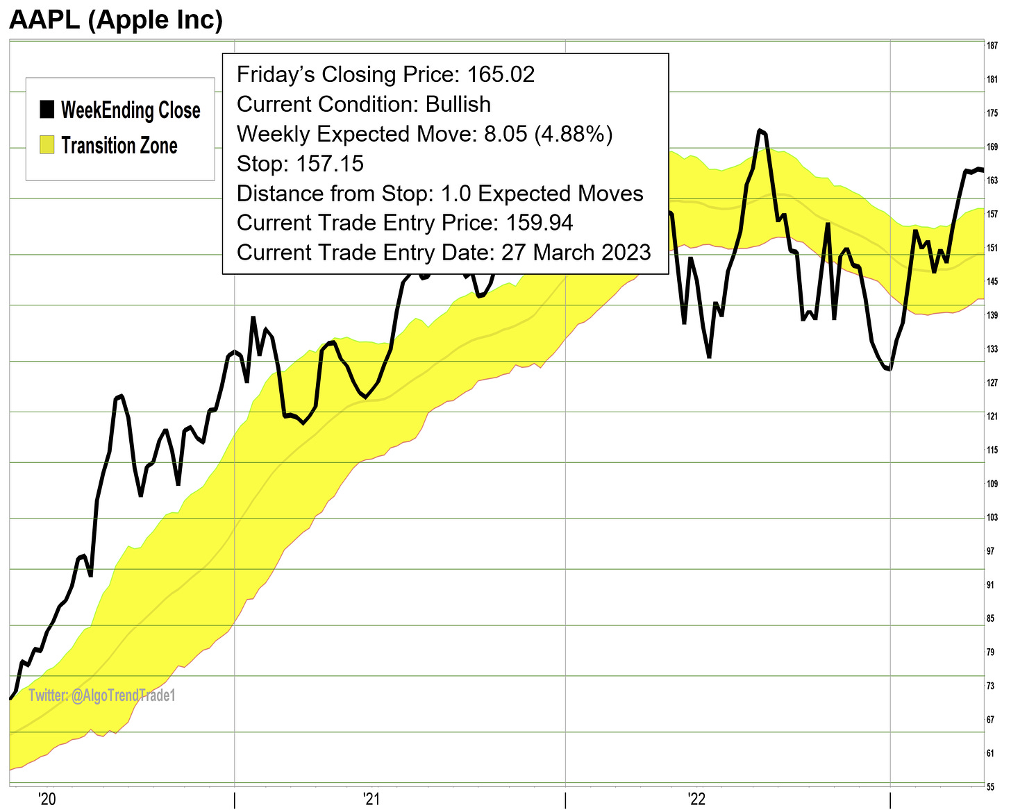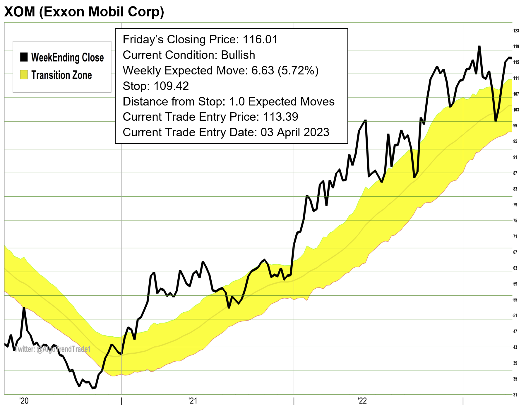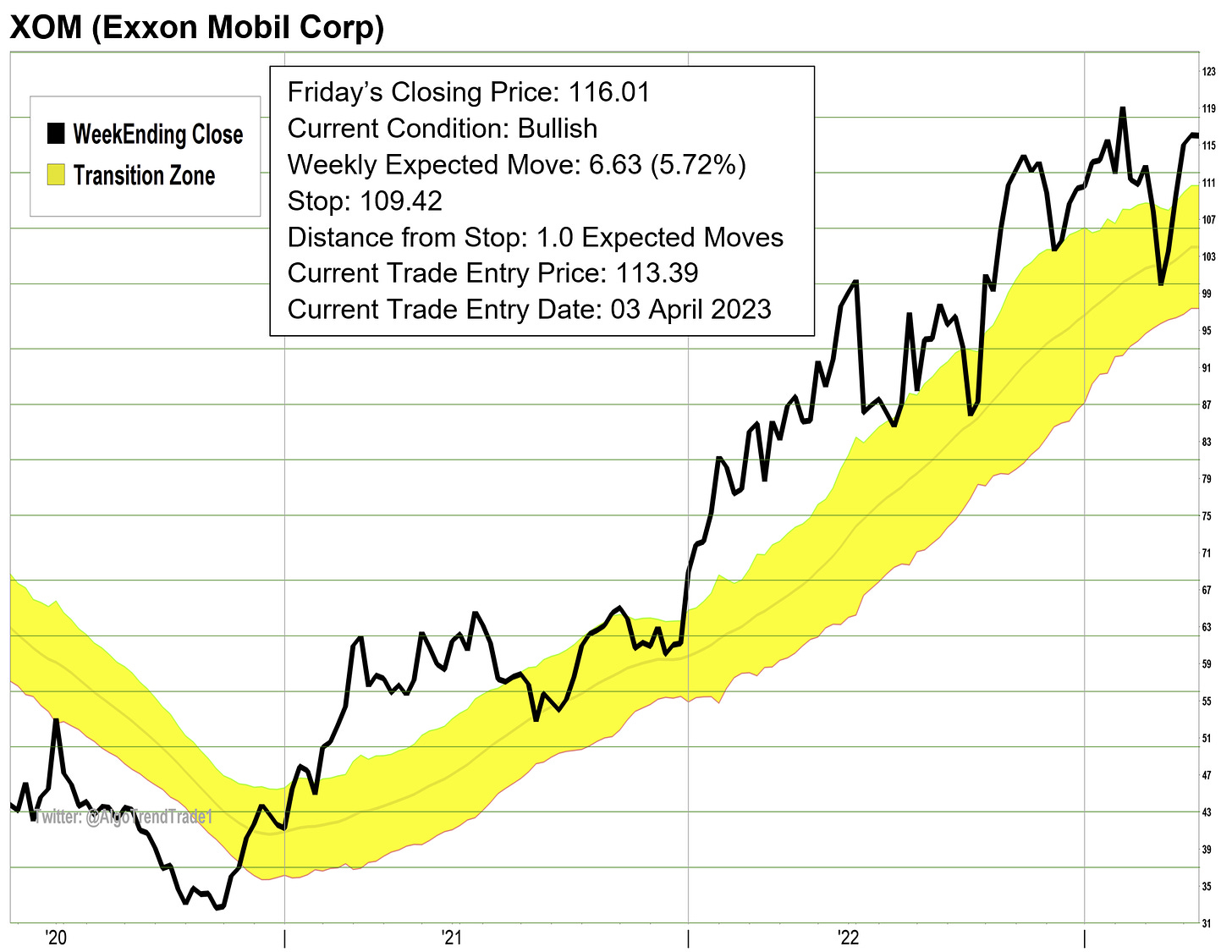 Every trade has a pre-determined exit strategy. This is based on the normal volatility of the underlying ticker. Each stock has its own unique volatility. And, volatility is dynamic. It’s constantly changing. Each week, we look at the previous 52 weeks of price movement to come up with its normal weekly volatility. This is called the “Expected Move”. The Expected Move equals one week of the normal volatility of the stock or ETF being measured. Every week, the exit strategy for each ticker is updated.