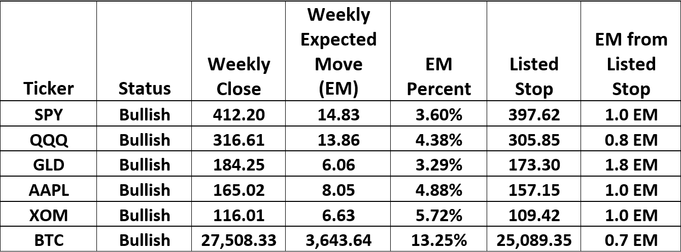 Both Bitcoin (BTC) and Gold (GLD) hit a bump last week. Each lost about half of their respective Expected Moves (EM). The exit strategy on each is now less than 1 EM from hitting the listed stop. There’s a good chance that could happen this week. Be sure to watch your stops closely.