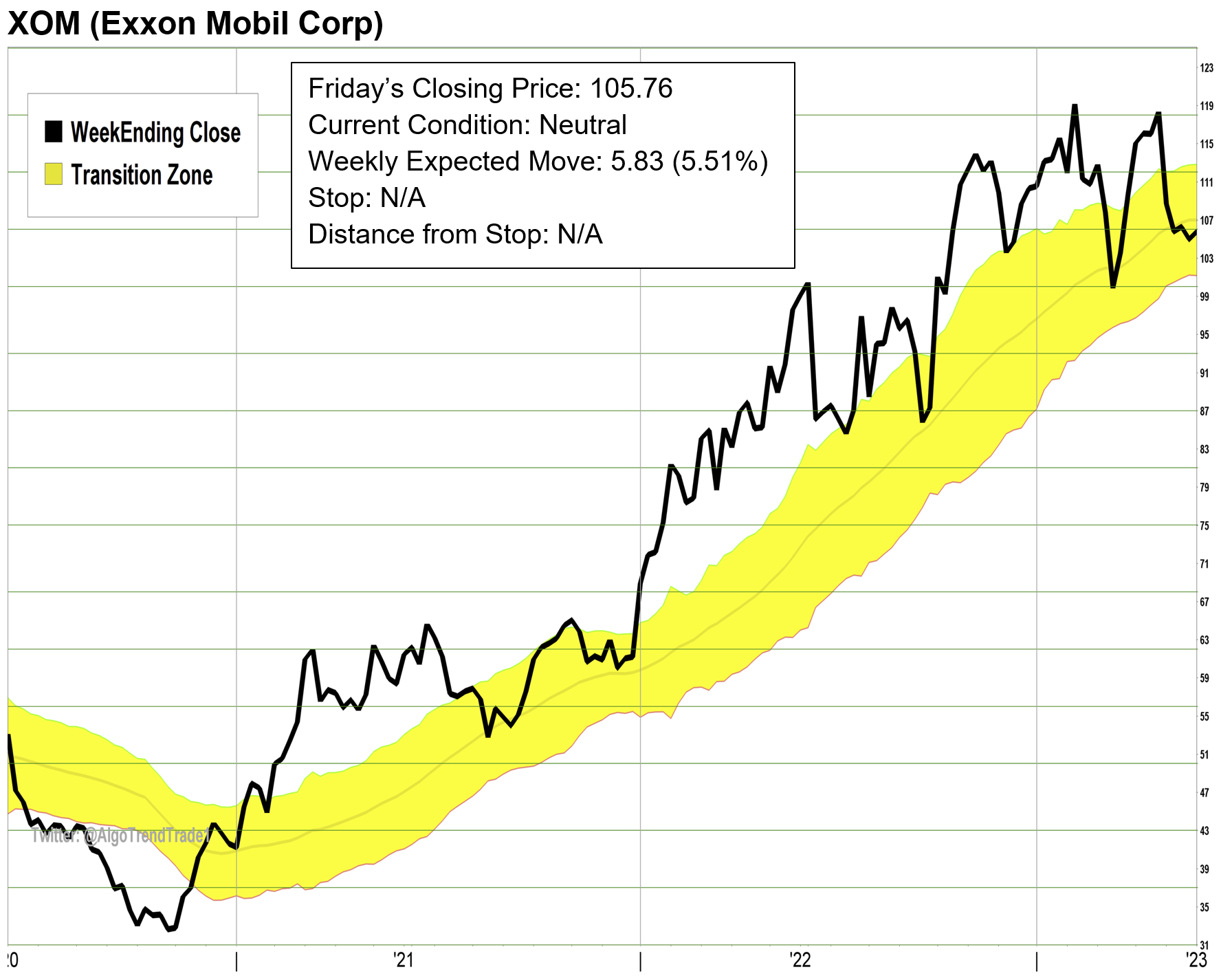 AlgoTrendTraders uses both trend and momentum to generate the trading signals. The yellow channel you see in the center of the charts is called the “Transition Zone”. When a stock is above the yellow channel, it’s in a Bullish condition. When it’s below the yellow channel, it’s in a Bearish condition. When it’s in the middle of the channel, it’s in a Neutral condition and there is no trade.