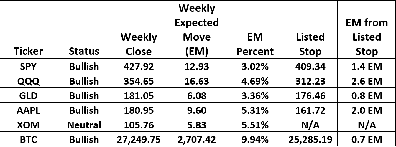Technology stocks continue their strong moves higher and that’s reflected in the QQQ closing price. The Expected Move (EM), our measure of volatility, also moved higher in QQQ last week. The expansion of volatility is a good thing for our bullish trades as this increase moves the exit strategies a little higher. Assuming no price gaps to the downside, four out of our five bullish trades are locked in with small profits. The longer these uptrends remain in place, the more profit we should be able to show on paper each week as the stops move higher.