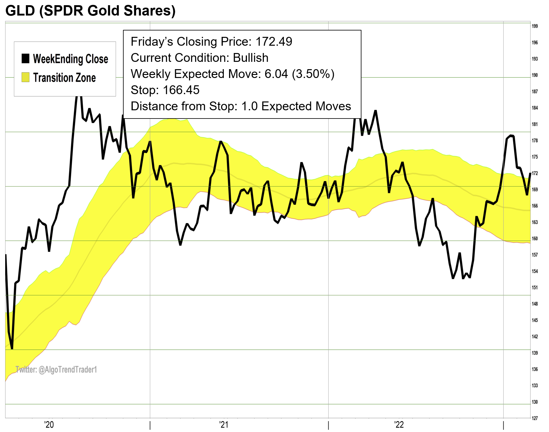 Gold closed above the yellow-channel Transition Zone this week. It is now in a Bullish condition. This applies to both the underlying commodity and the GLD ETF that we follow. If GLD opens trading on Monday below $171.62, there is no trade.