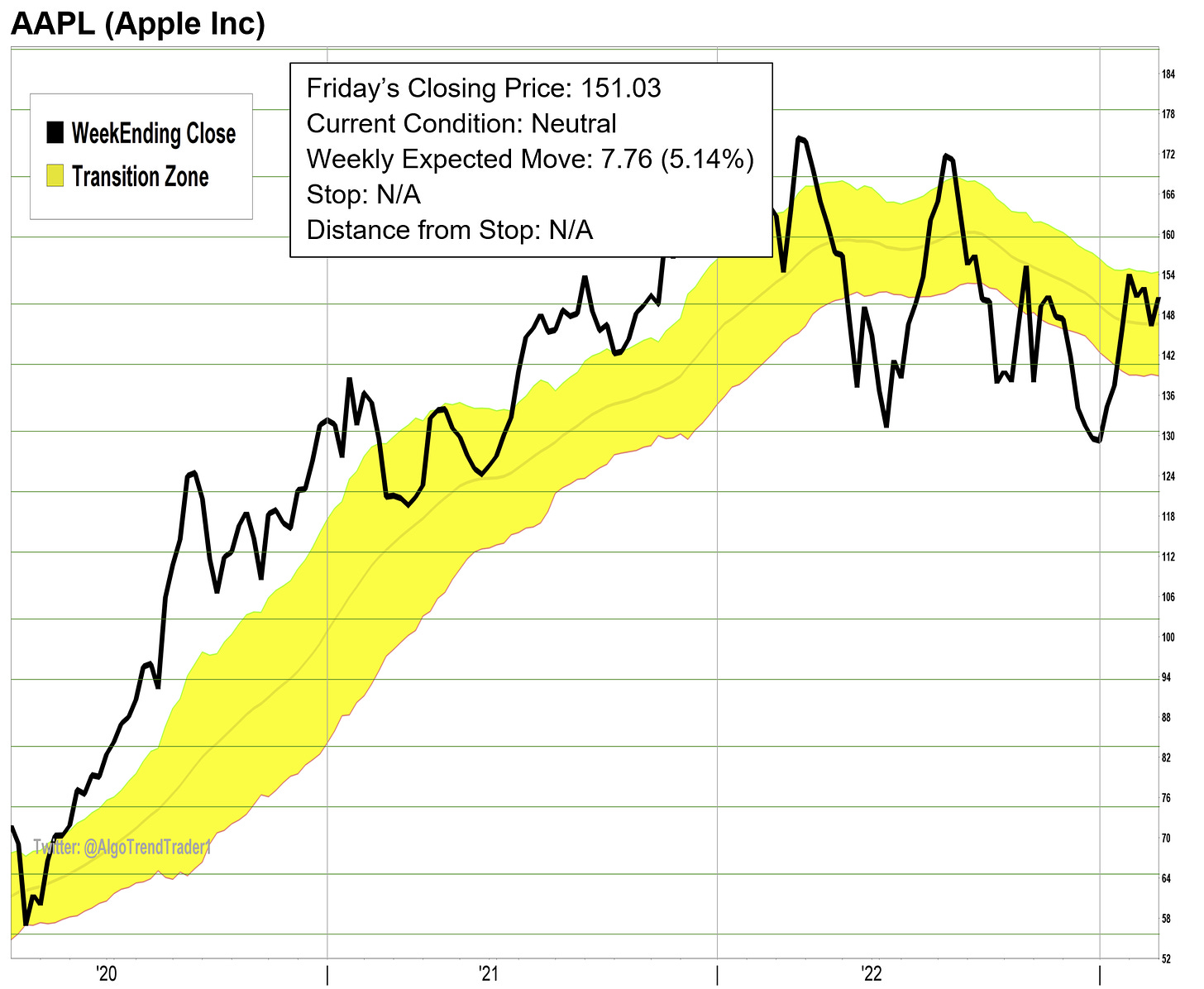 AlgoTrendTraders uses both trend and momentum to generate the trading signals. The yellow channel you see in the center of the charts is called the “Transition Zone”. When a stock is above the yellow channel, it’s in a Bullish condition. When it’s below the yellow channel, it’s in a Bearish condition. When it’s in the middle of the channel, it’s in a Neutral condition and there is no trade.