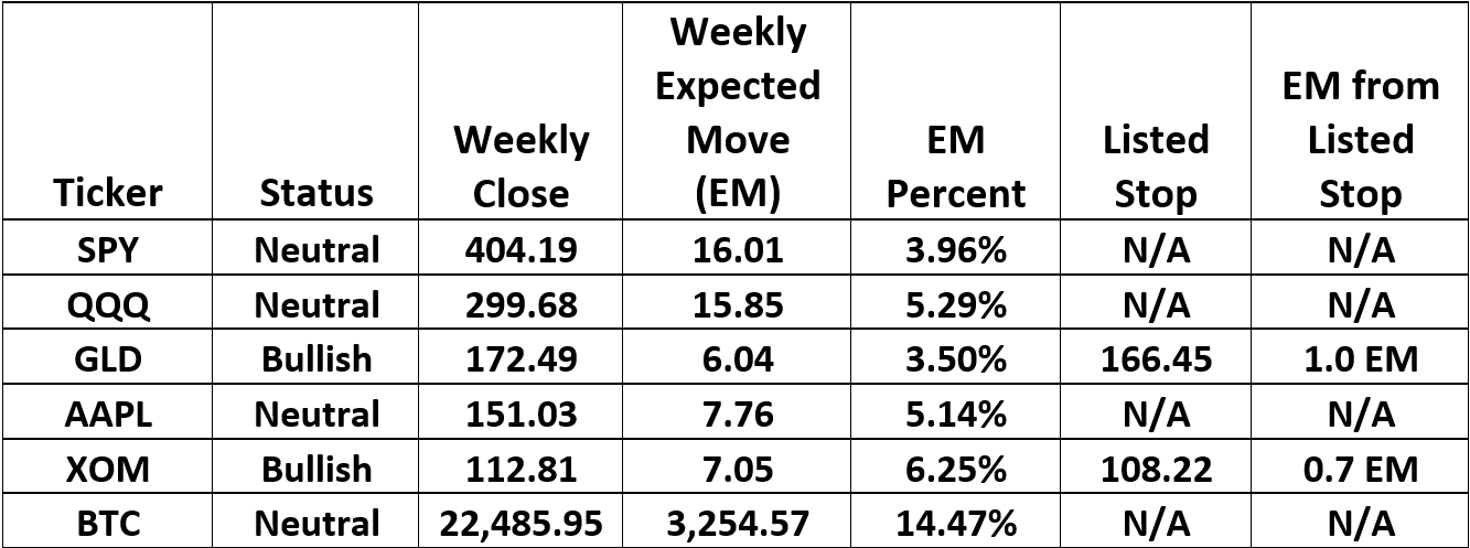 Every trade has a pre-determined exit strategy. This is based on the normal volatility of the underlying ticker. Each stock has its own unique volatility. And, volatility is dynamic. It’s constantly changing. Each week, we look at the previous 52 weeks of price movement to come up with its normal weekly volatility. This is called the “Expected Move”. The Expected Move equals one week of the normal volatility of the stock or ETF being measured. Every week, the exit strategy for each ticker is updated.