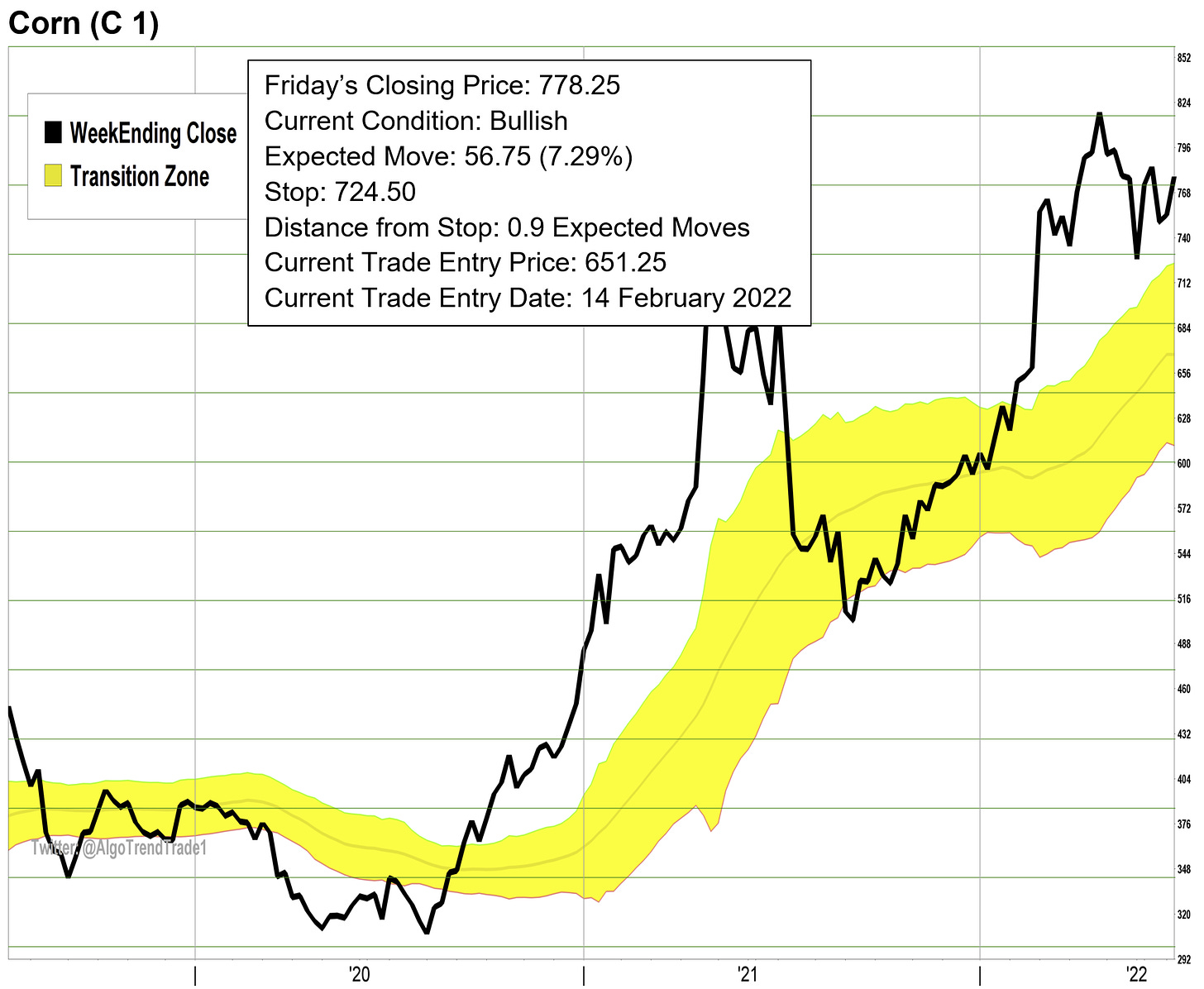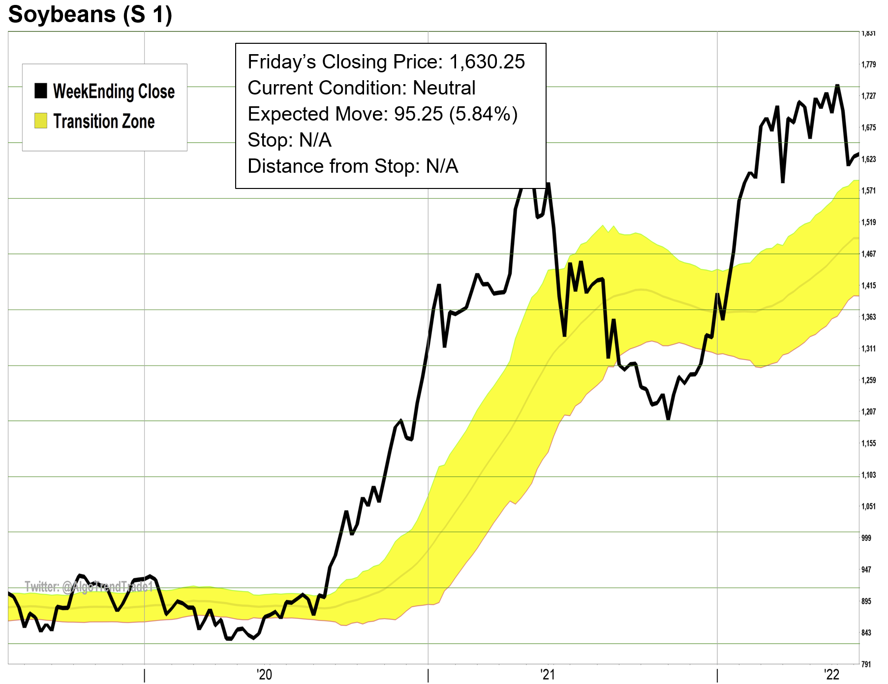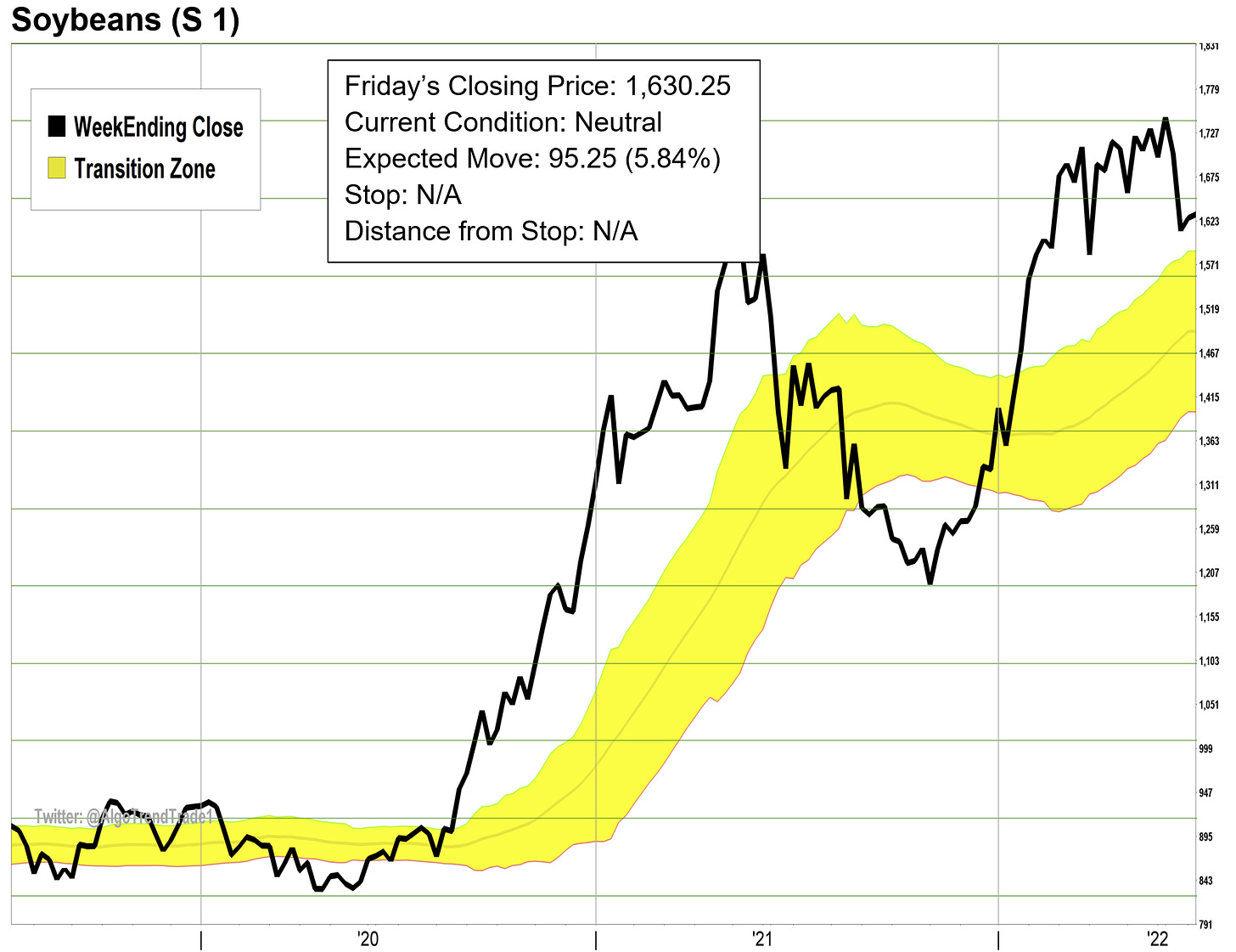 The bullish trades in WTI Crude Oil and Soybeans each hit their respective stops last week and are now in Neutral conditions. The trade in oil lost -8.72% off a previous gain of +37.25%. The trade in Soybeans lasted a little more than 5 months and closed with a gain of +7.09%. The only remaining bullish trade is in Corn.