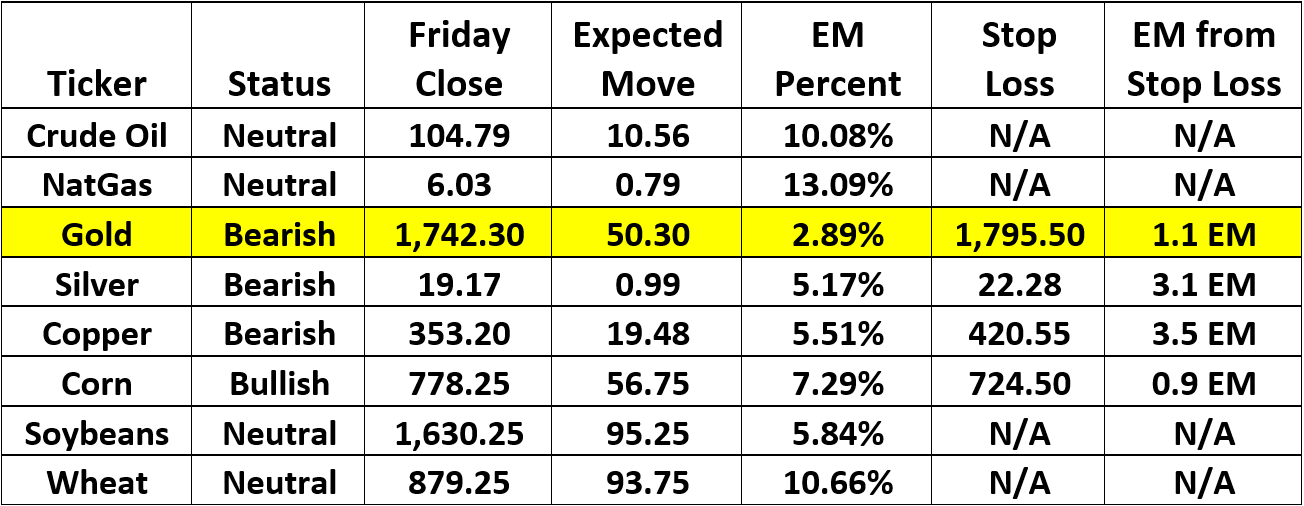 Every trade has a pre-determined exit strategy. This is based on the normal volatility of the underlying ticker. Each commodity has its own unique volatility. And volatility is dynamic. It’s constantly changing. Each week, we look at the previous 52 weeks of price movement to come up with its normal weekly volatility. This is called the “Expected Move”. The Expected Move equals one week of the normal volatility of the stock or ETF being measured. Every week, the exit strategy for each ticker is updated.