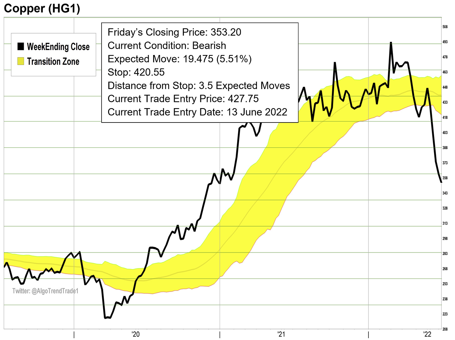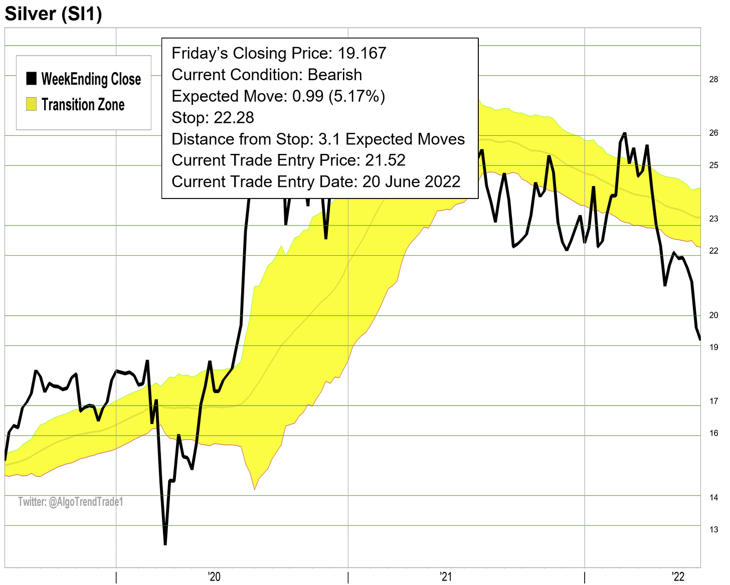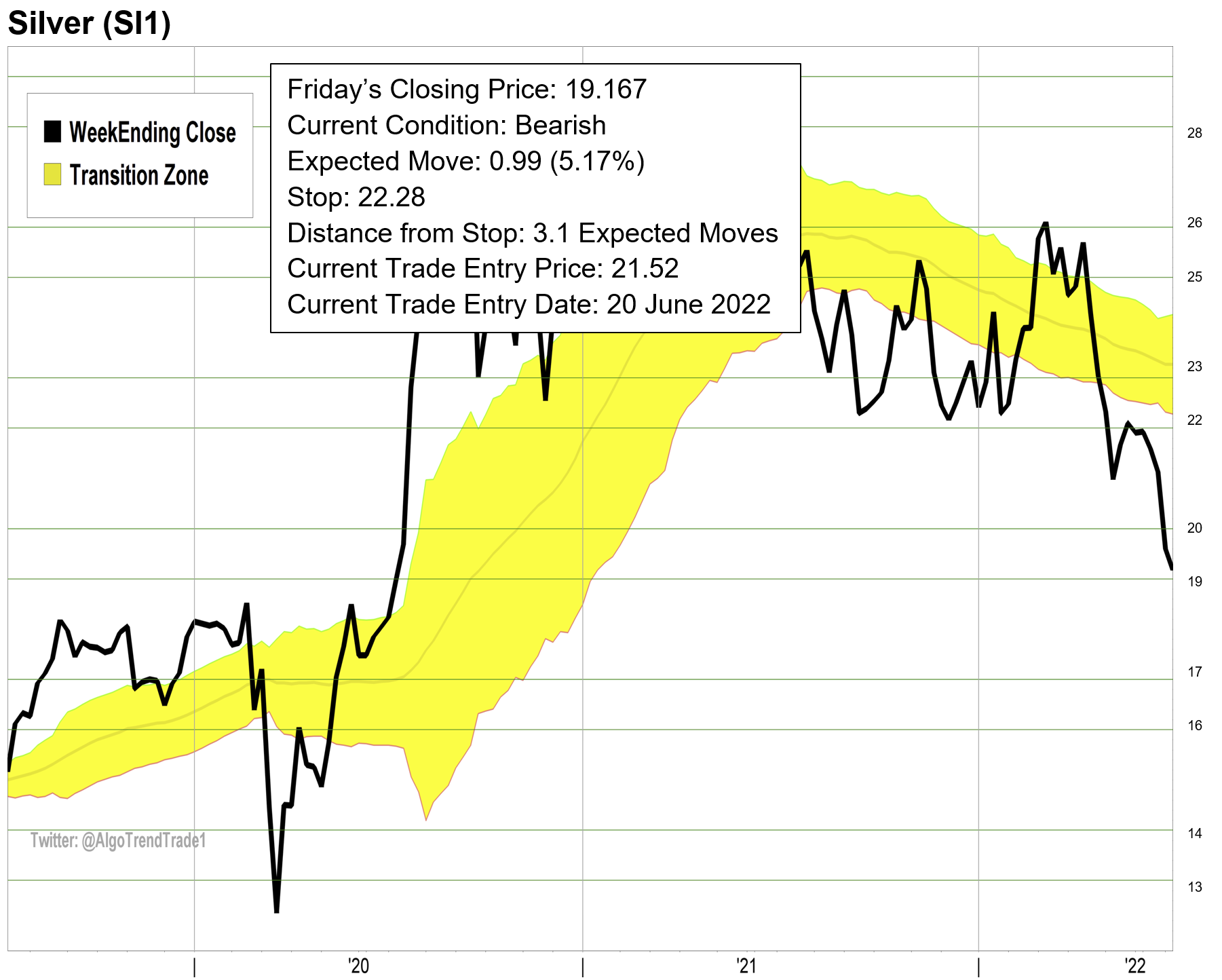 Silver closed lower again last week and remains in a Bearish condition. The current exit for the bearish trade is 22.28 which is 3.1 EM from Friday’s closing price.