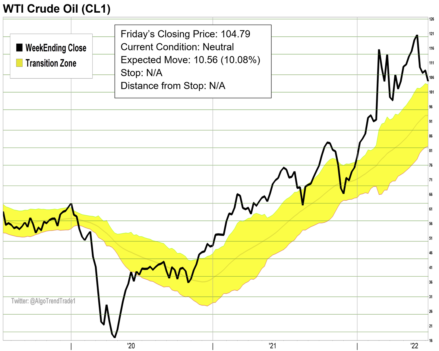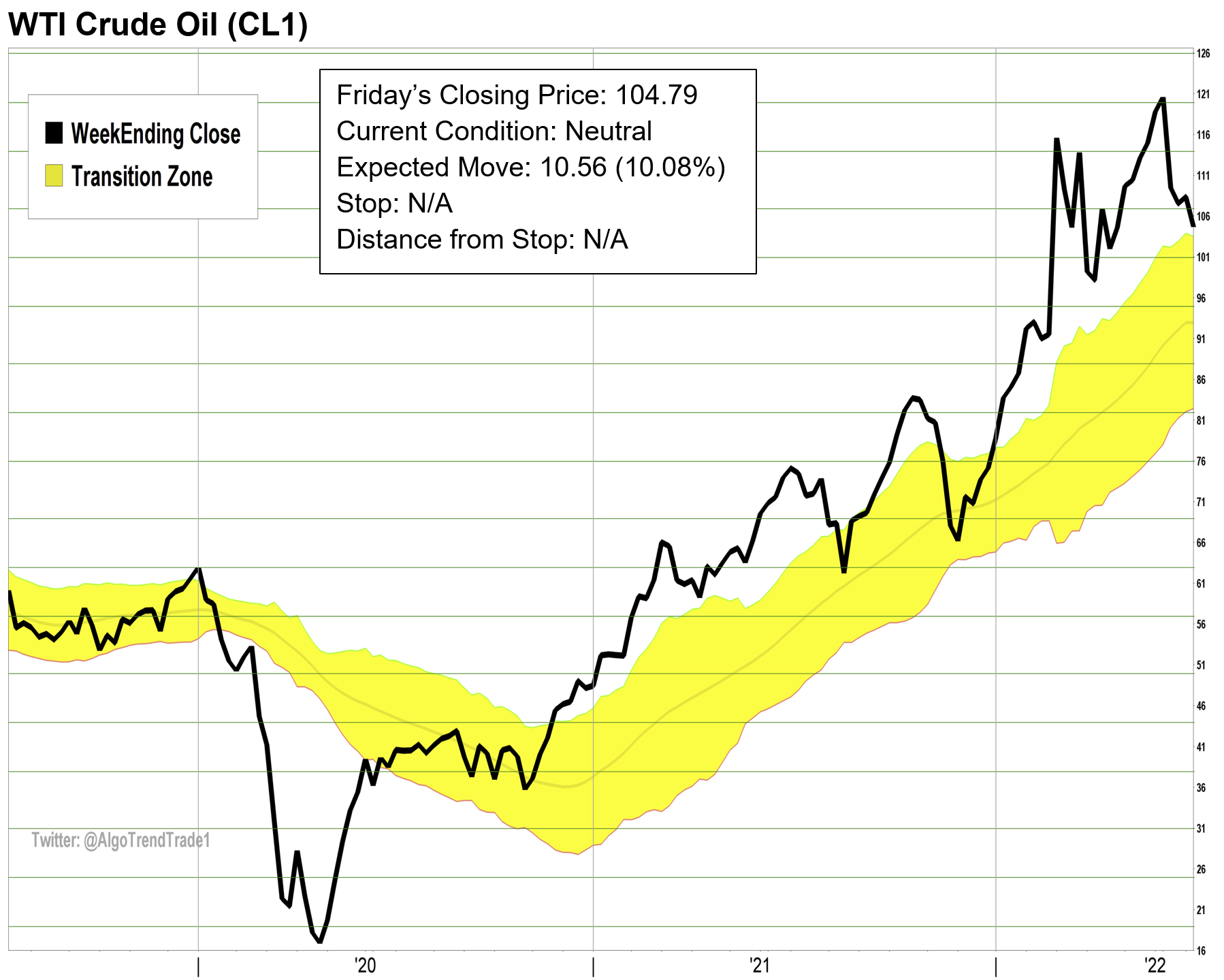 WTI Crude Oil closed lower last week and hit its listed stop. WTI Crude is now in a Neutral condition. There is no trade this week.