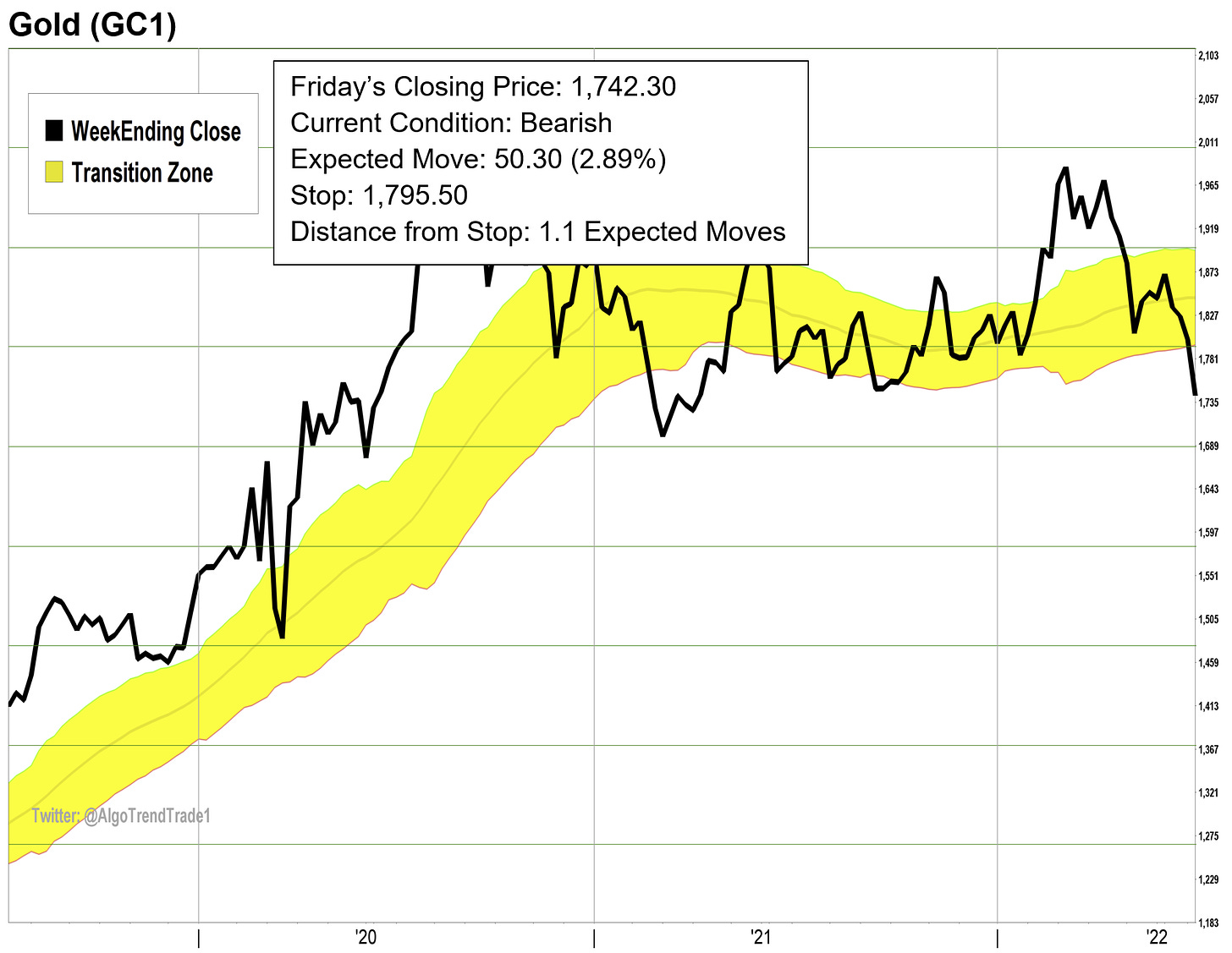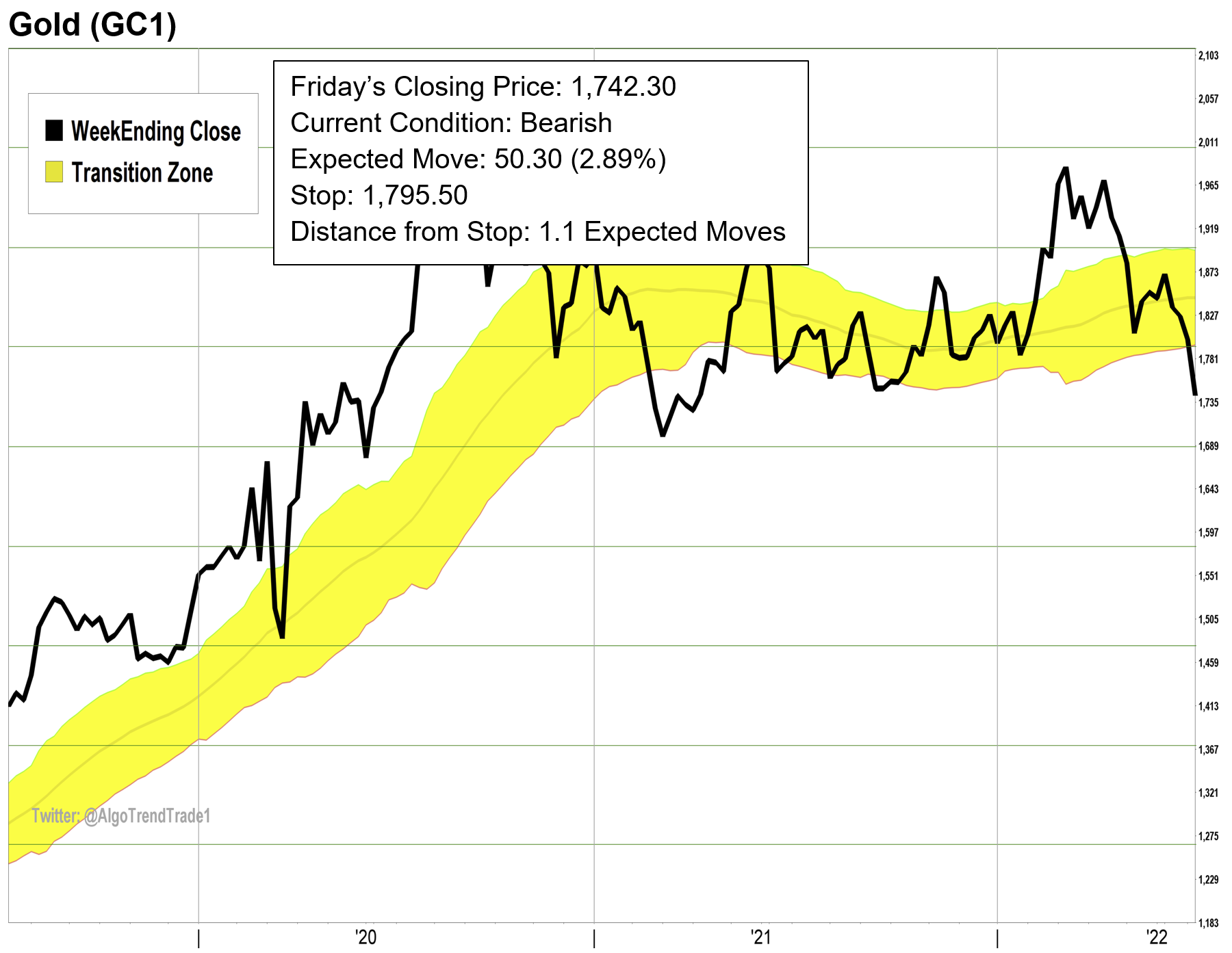 Gold closed lower again last week and closed below the TZ in a Bearish condition. The initial exit on the bearish trade is 1795.50 which is 1.1 Expected Moves (EM) from Friday’s closing price.