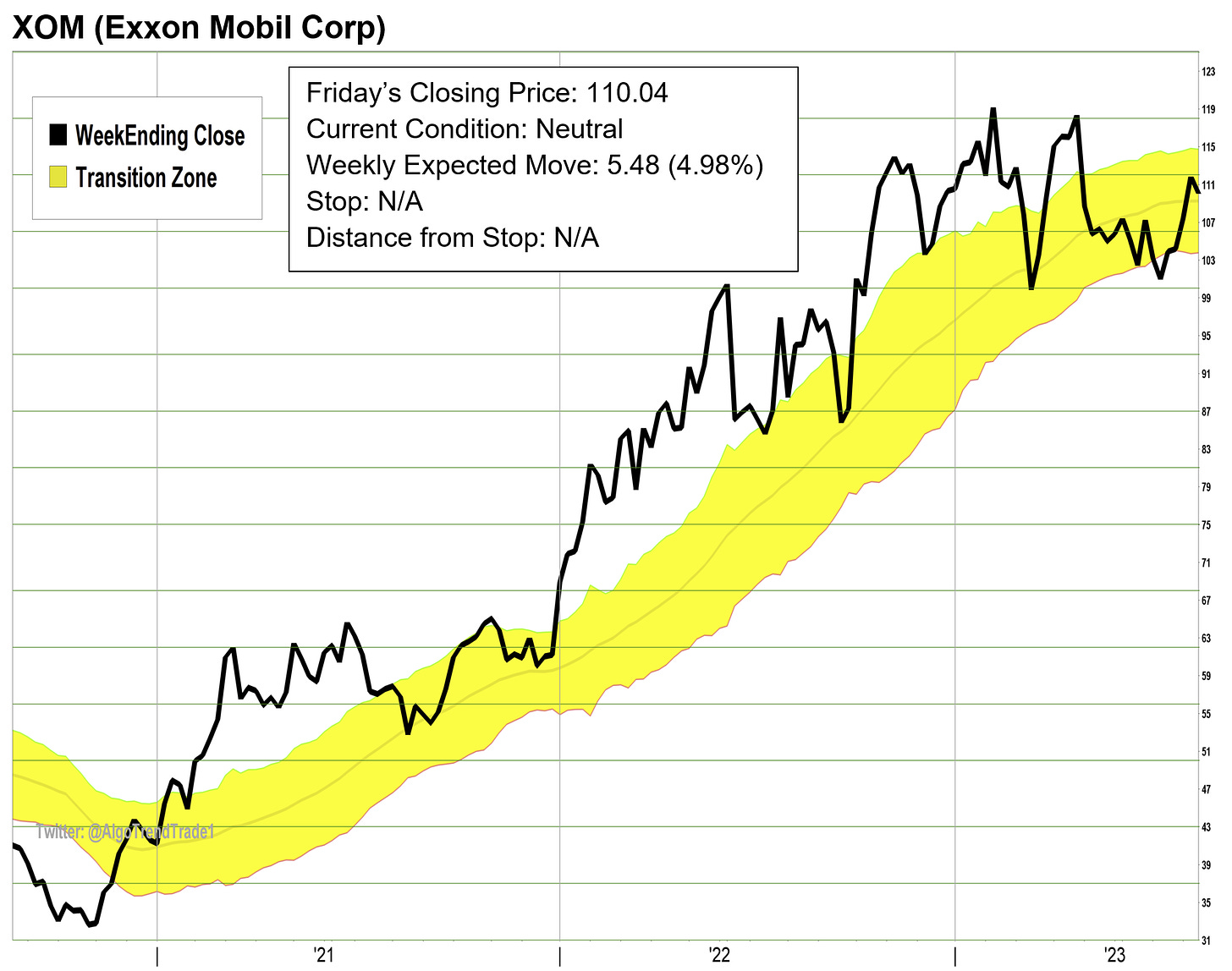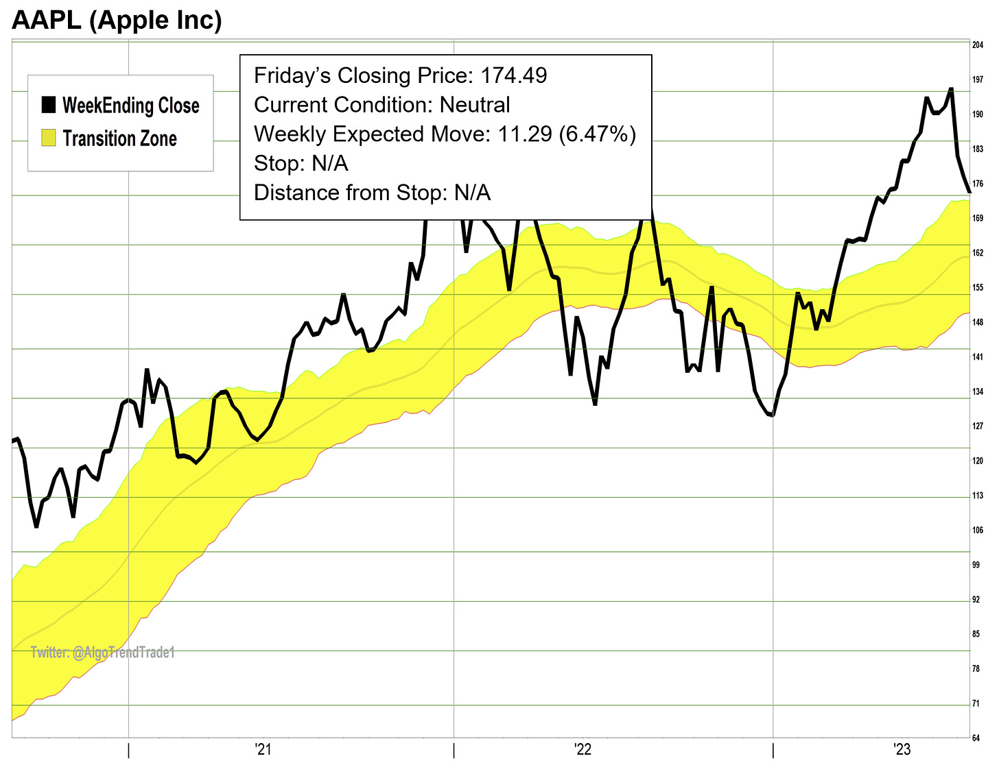 By the way, we have almost the opposite of the same situation this week. AAPL is trading just above the top of the TZ, but it’s listed as “Neutral”. Our rules don’t allow us to get into a trade the week after getting stopped out.