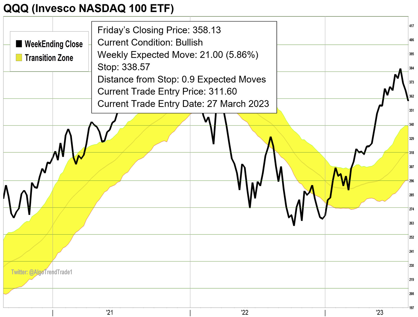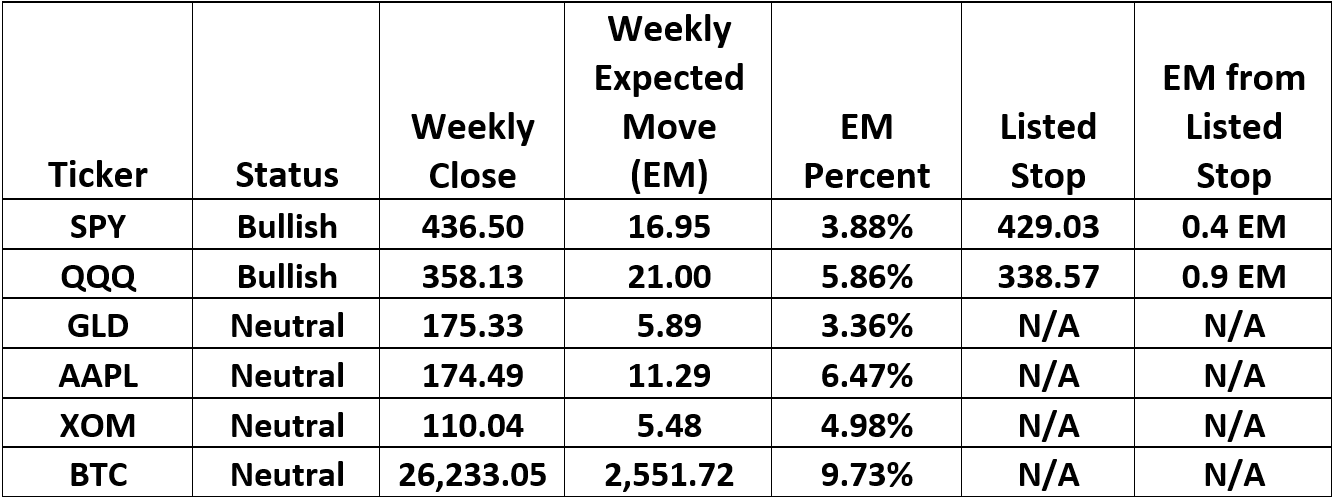 That was quite the week last week as 3 of our bullish trades hit their listed stops. GLD, AAPL, and Bitcoin all have now moved into Neutral conditions. Only SPY and QQQ remain bullish and both of those have exits less than one Expected Move (EM).