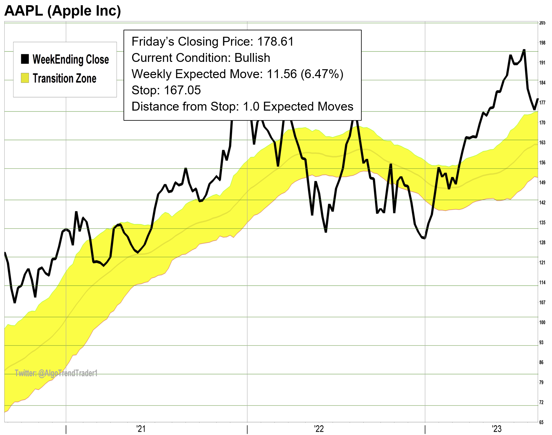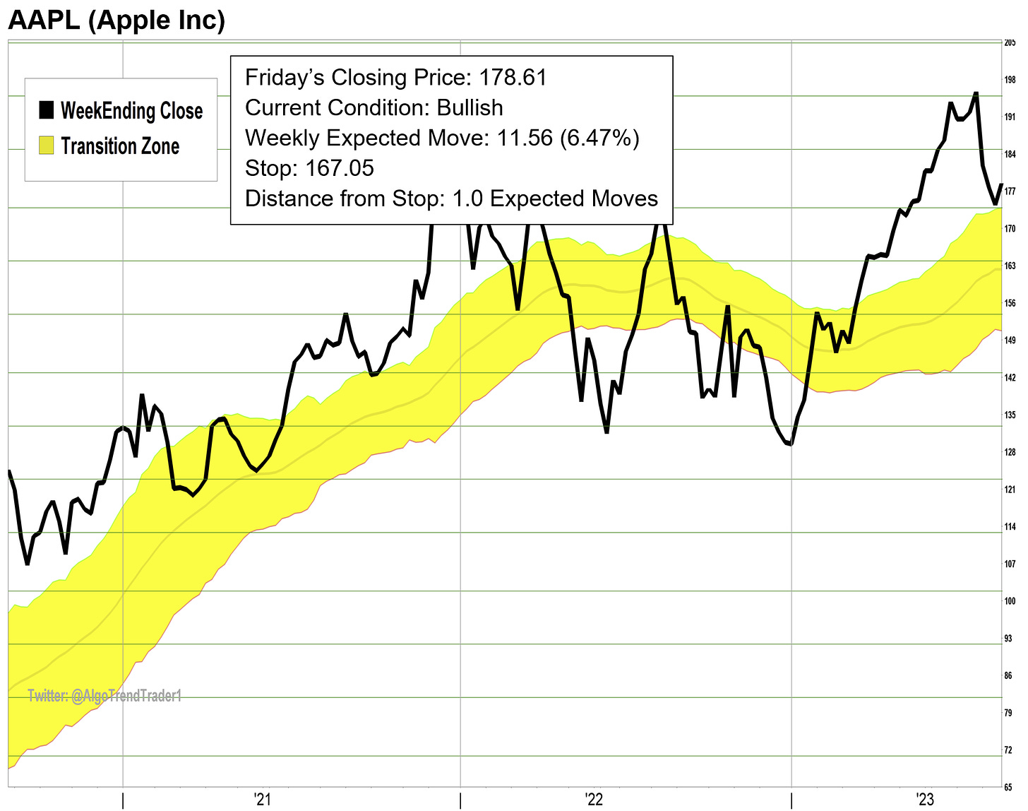 Last week’s rally moved AAPL back above the top of the yellow channel Transition Zone (TZ) and into a new Bullish condition. The current stop of $167.05 is inside the TZ instead of at the top of the zone which is currently $174.00. The reason for this is we want to give the trade a full Expected Move (EM) to give it enough room to stay within its normal weekly volatility. If AAPL trades midweek below $174.00, but stays above $167.05, the current trade will remain in place, but the “action” would be to stay on the sidelines and not initiate any new position.