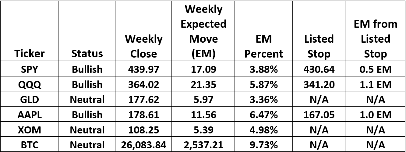 Every trade has a pre-determined exit strategy. This is based on the normal volatility of the underlying ticker. Each stock has its own unique volatility. And, volatility is dynamic. It’s constantly changing. Each week, we look at the previous 52 weeks of price movement to come up with its normal weekly volatility. This is called the “Expected Move”. The Expected Move equals one week of the normal volatility of the stock or ETF being measured. Every week, the exit strategy for each ticker is updated.