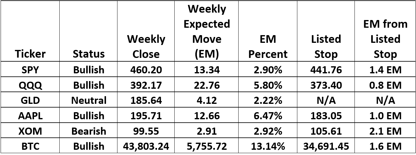 The remaining five trades have been updated (and yes, they all ended the week having moved in our direction). SPY, QQQ, AAPL, and BTC all moved higher while XOM moved lower.