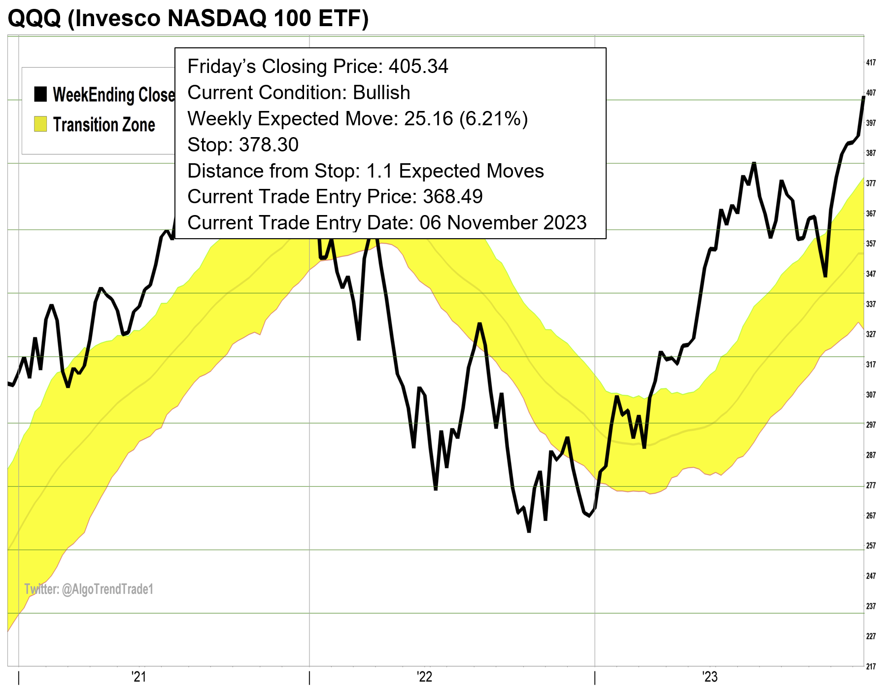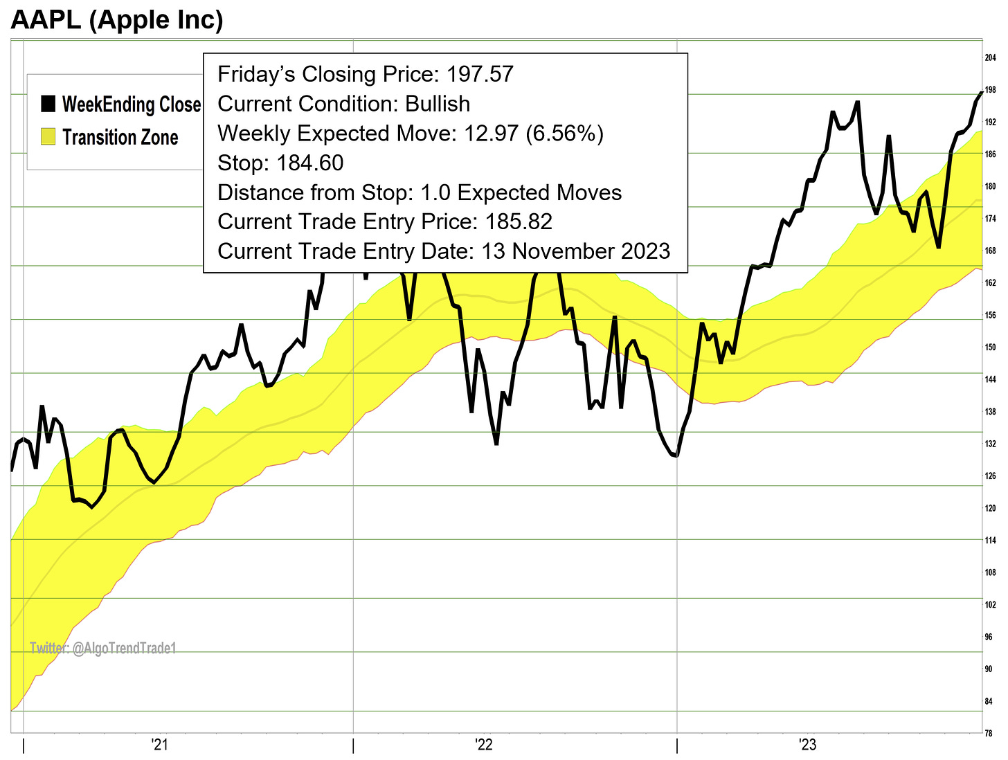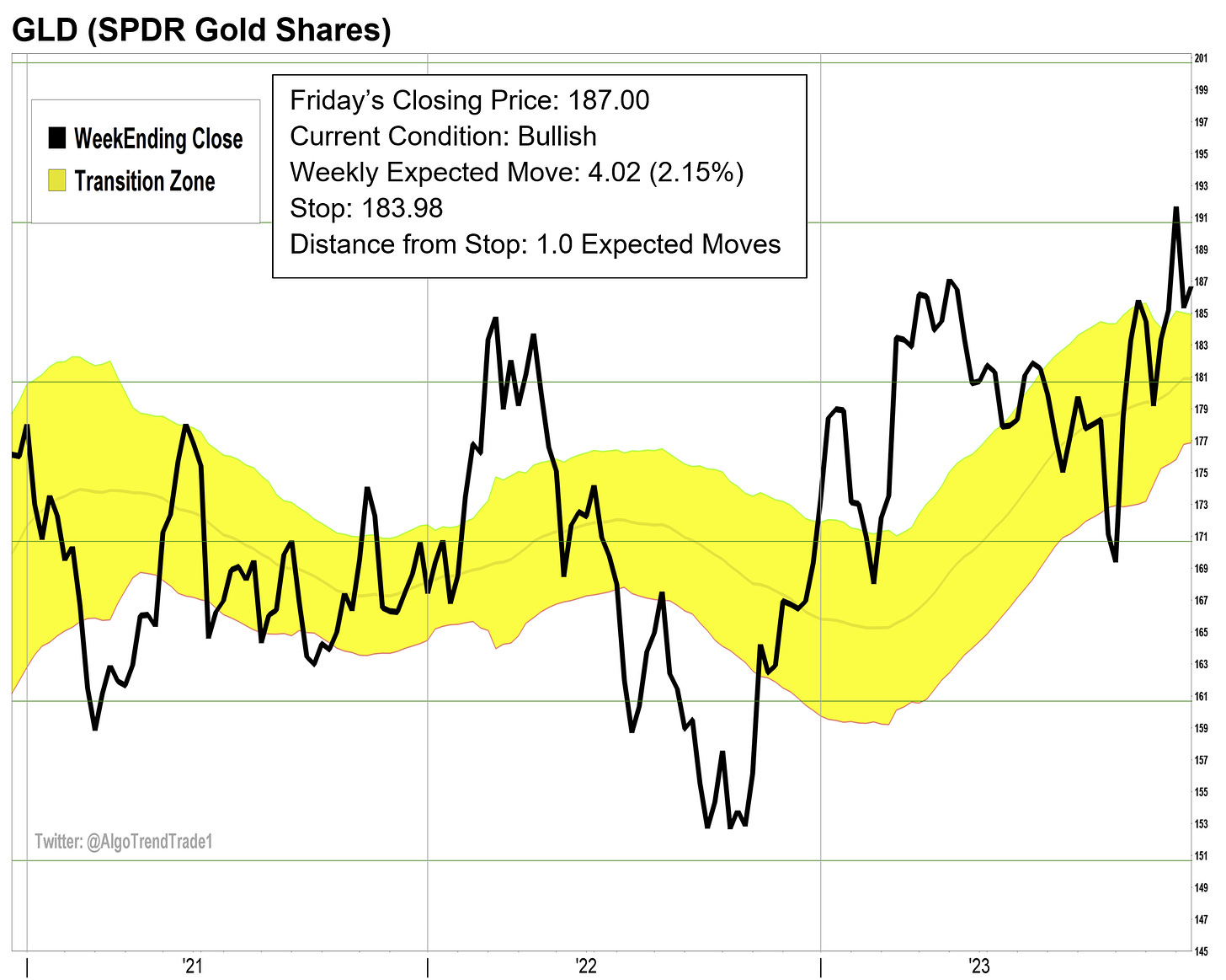 Gold has been a frustrating ticker to trend-trade over the past several years. We get a good run in either direction, and then gold whipsaws us out of the trades. Right now, GLD is slightly above the yellow channel Transition Zone (TZ) as of the weekly update. This puts it into a Bullish condition and a new bullish trade. However, if GLD opens trading on Monday below $185.23, there is no trade this week.