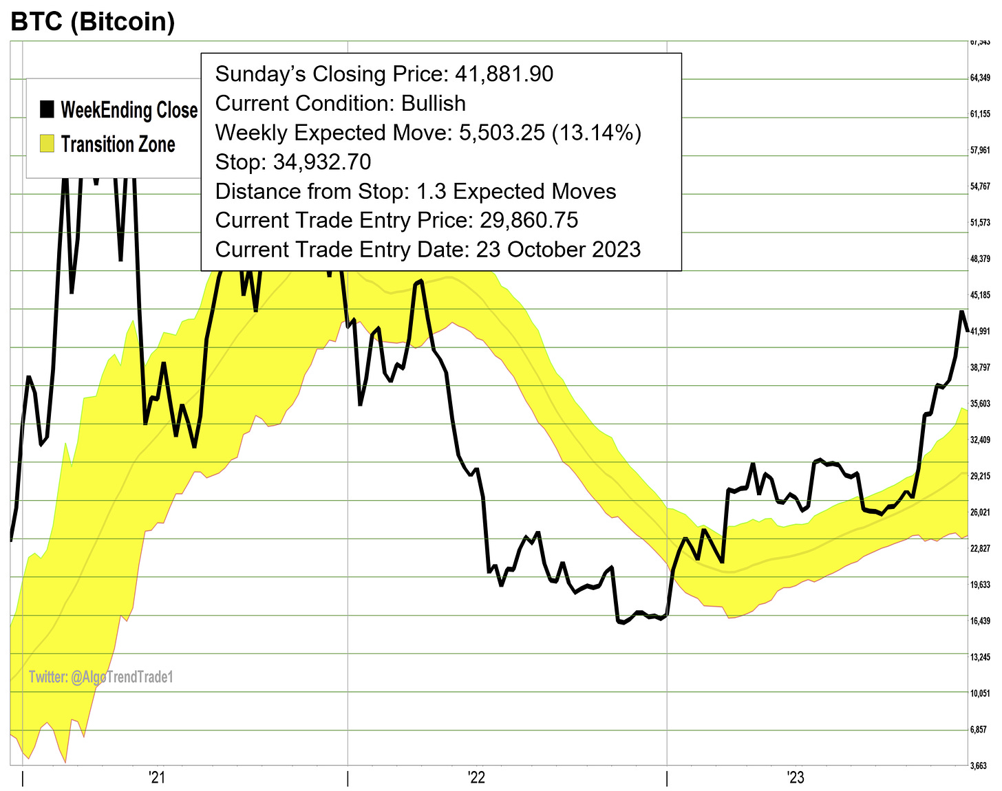 The price of BTC closed down a couple thousand dollars for the week and is trading below $41,000 on Sunday evening. It’s not surprising that BTC is taking a breather after the powerful rally of the past couple of months. The listed exit strategy is still more than 1 Expected Move away from the current price.