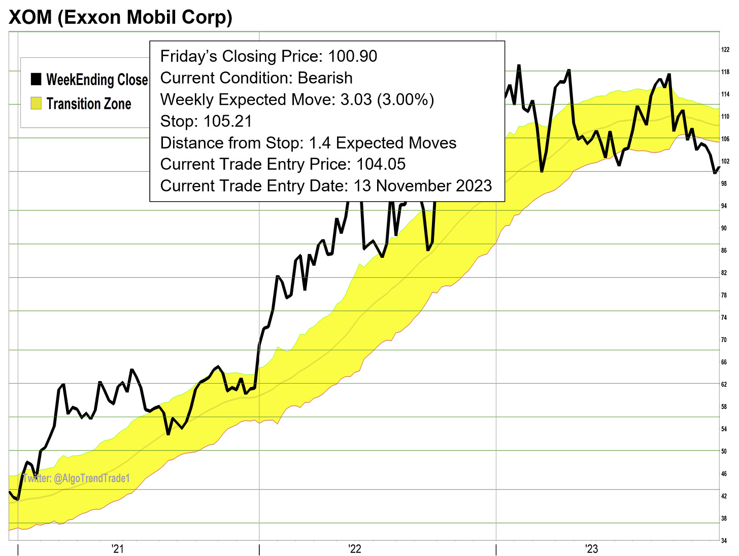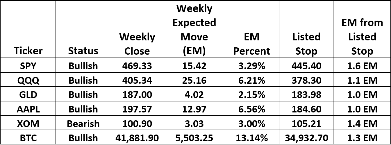 Every trade has a pre-determined exit strategy. This is based on the normal volatility of the underlying ticker. Each stock has its own unique volatility. And, volatility is dynamic. It’s constantly changing. Each week, we look at the previous 52 weeks of price movement to come up with its normal weekly volatility. This is called the “Expected Move”. The Expected Move equals one week of the normal volatility of the stock or ETF being measured. Every week, the exit strategy for each ticker is updated.
