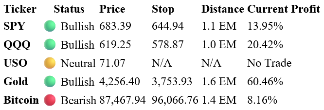 📈 Market Strength Returns: Broad rally brings sectors back to bullish conditions. SPY at 683.39 and QQQ at 619.25 show strong momentum, though both remain within 1.0-1.1 EM of stops. Profits extend to 13.95% and 20.42% respectively.