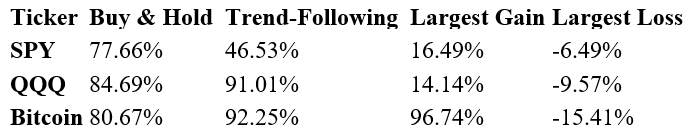 During that same period, the trend-following strategy test did fantastic. SPY trades were up 67% over the same timeframe and QQQ trades were up 177%. Remember, this is based on a backtest, not real results. But even assuming trend-following returns were half that, it’s still a positive result during a very difficult timeframe.