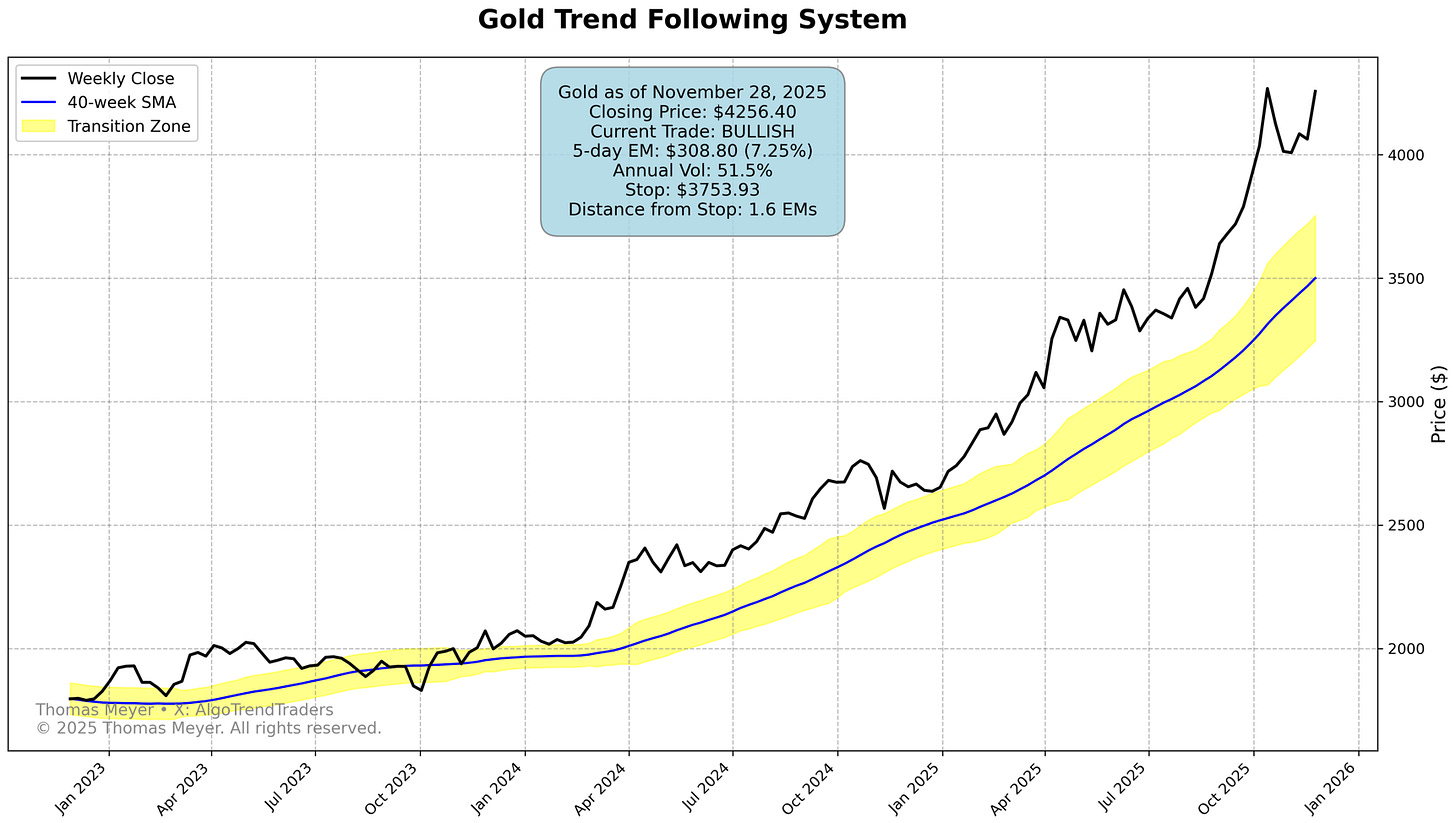 🥇 Gold Near All-Time Highs: Consolidates at 4,256.40 with impressive 60.46% profit since January entry. Maintains comfortable 1.6 EM distance from stop at 3,753.93 - strongest position in portfolio.