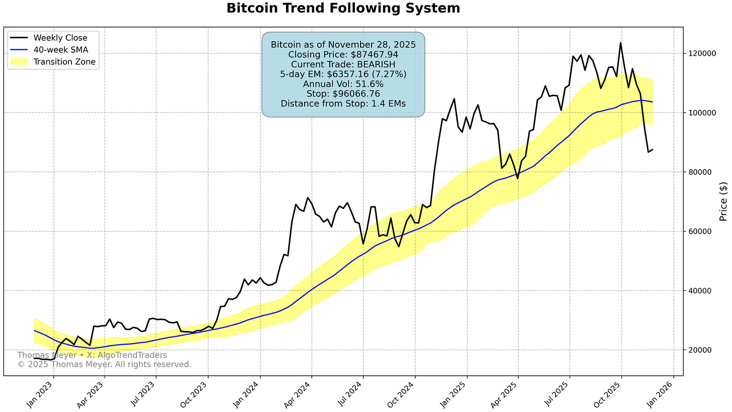 ₿ Bitcoin Short Profitable: Two-week-old bearish trade continues working as price drops to 87,467.94. Now showing 8.16% profit with stop 1.4 EM away. Consider using 1 EM trailing stop at $93,824.10 to lock in gains if Bitcoin rebounds.