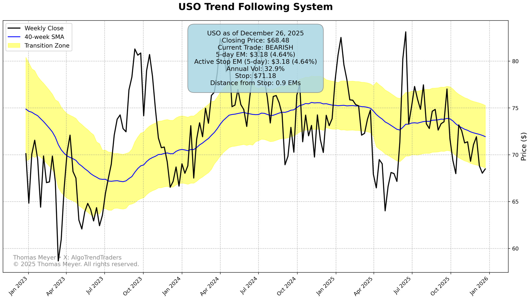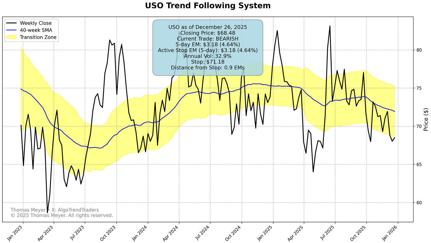 🛢️ USO Holding Pattern: Crude oil remains essentially flat at the entry price of 68.48, providing minimal profit on the bearish trade. Distance from stop at 0.9 EM suggests this position needs monitoring - oil could whipsaw in either direction.