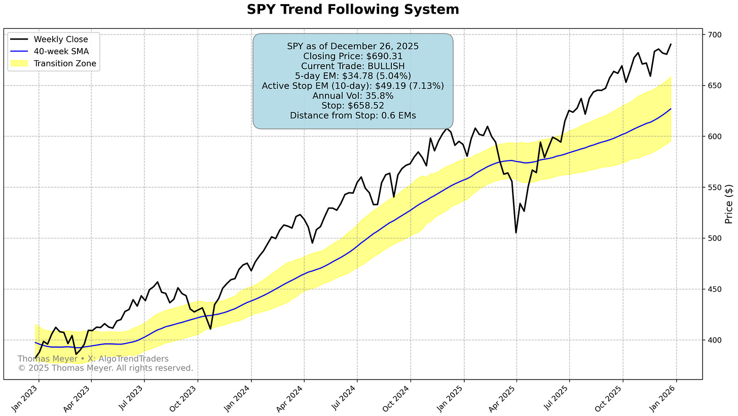 With just a few days to go in 2025, we’re going to end up the year underperforming the stock market in both SPY and QQQ. The sharp move down in the spring followed by the quick rebound hurt trend-followers. We’ve been in our long trades for more than 6 months and we’ll end up the year ok, but not as well as the buy and hold crowd did. We’re at all-time highs in the stock market and it looks like there’s no end in sight.