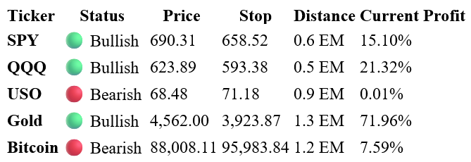 Markets edge higher with SPY touching record highs and moving to 690.31. Both major indices remain profitable but still within striking distance of stops - SPY at 0.6 EM, QQQ at 0.5 EM. Gold surges to 4,562.00 with exceptional 71.96% profit. Bitcoin trades in narrow range. No sector changes - maintaining 7 bullish, 3 neutral, 1 bearish as we close out 2025.