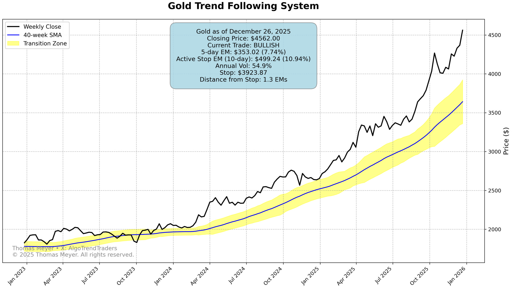 🥇 Gold Extends Exceptional Run: Gold continues its remarkable year, pushing to 4,562.00 and extending our profit to nearly 72% since the January entry. Distance from stop improved to 1.3 EM, providing even more cushion. This trade exemplifies the power of letting winners run - many investors would have exited long ago with 20-30% gains, missing the bulk of this extraordinary move.