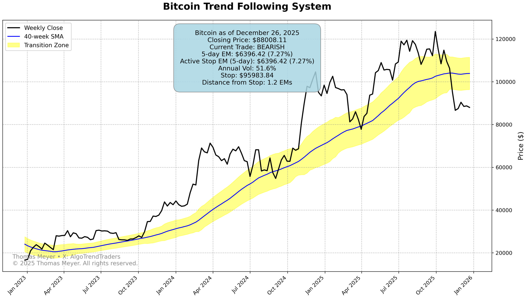 ₿ Bitcoin Narrow Range: Bitcoin closed a little lower this week at 88,008.11, but traded in a very narrow range of less than 5% from last week’s close. Because of this lower volatility, the Transition Zone is flat and not trending either way. The bearish trade continues working with 7.59% profit and comfortable 1.2 EM cushion.