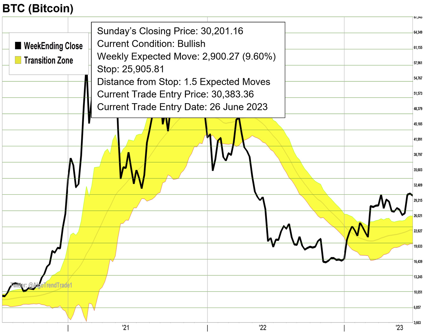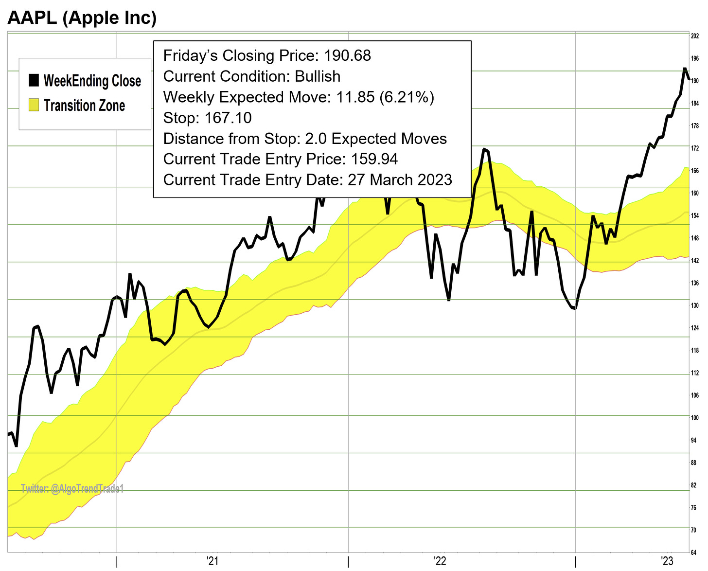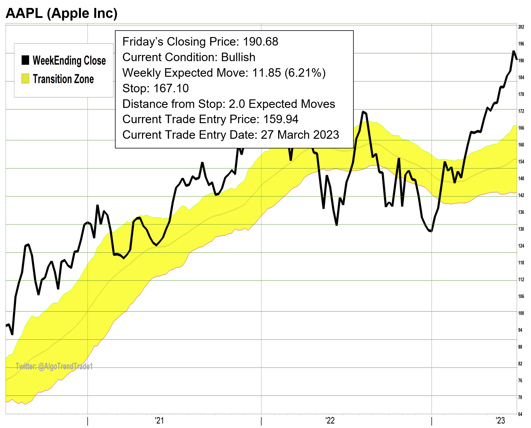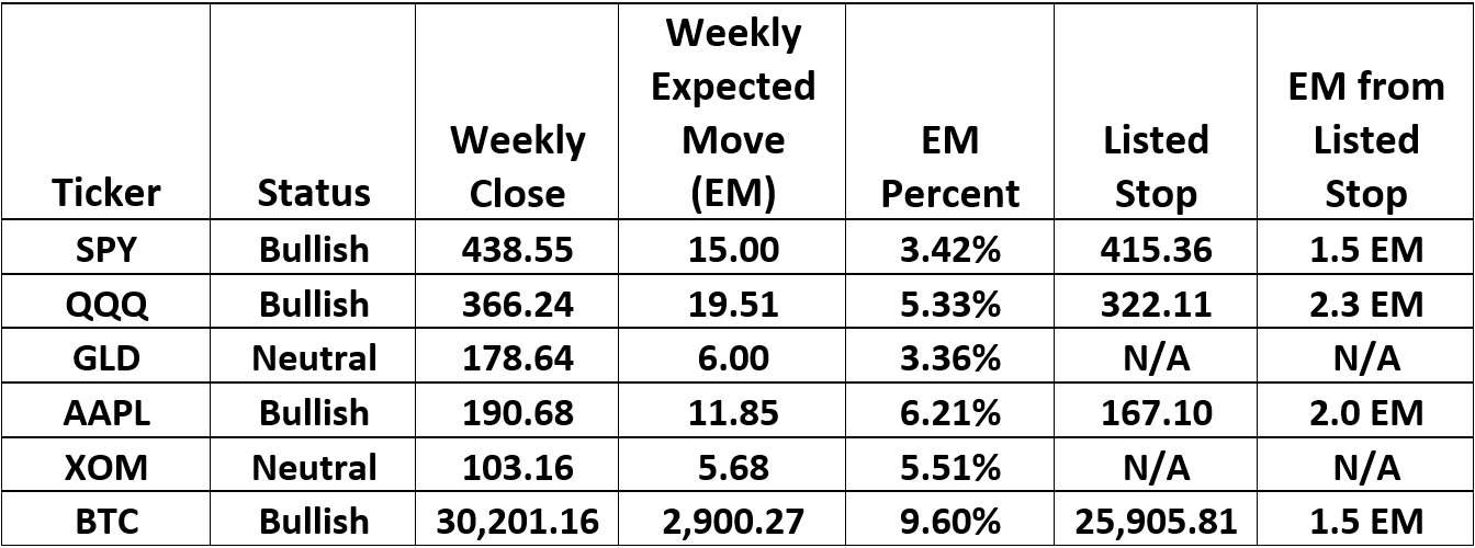 SPY, QQQ, and AAPL continue to be strongly bullish. Though they’ve had strong bullish runs, none of them are close to being in an overbought condition. Bitcoin is still bullish. It fell a little for the week, however the listed stop moved a bit higher. All of the information is listed below.