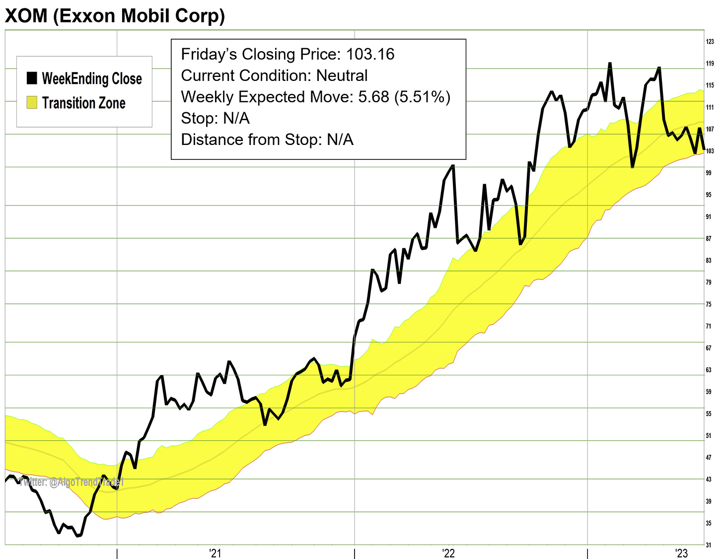 Every trade has a pre-determined exit strategy. This is based on the normal volatility of the underlying ticker. Each stock has its own unique volatility. And, volatility is dynamic. It’s constantly changing. Each week, we look at the previous 52 weeks of price movement to come up with its normal weekly volatility. This is called the “Expected Move”. The Expected Move equals one week of the normal volatility of the stock or ETF being measured. Every week, the exit strategy for each ticker is updated.