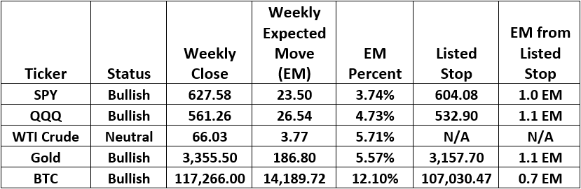 Every trade has a pre-determined exit strategy. This is based on the normal volatility of the underlying ticker. Each stock has its own unique volatility. And the volatility is dynamic. It’s constantly changing. Each week, we look at the previous 52 weeks of price movement to come up with its normal weekly volatility. This is called the “Expected Move”. The Expected Move equals one week of the normal volatility of the stock or ETF being measured. Every week, the exit strategy for each ticker is updated.