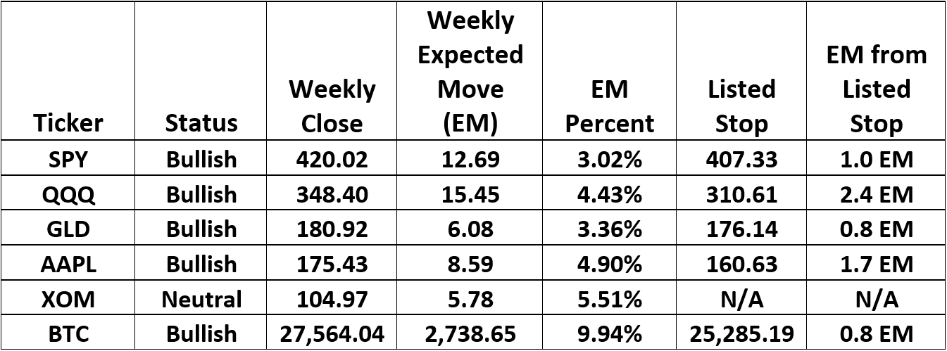 Every trade has a pre-determined exit strategy. This is based on the normal volatility of the underlying ticker. Each stock has its own unique volatility. And, volatility is dynamic. It’s constantly changing. Each week, we look at the previous 52 weeks of price movement to come up with its normal weekly volatility. This is called the “Expected Move”. The Expected Move equals one week of the normal volatility of the stock or ETF being measured. Every week, the exit strategy for each ticker is updated.