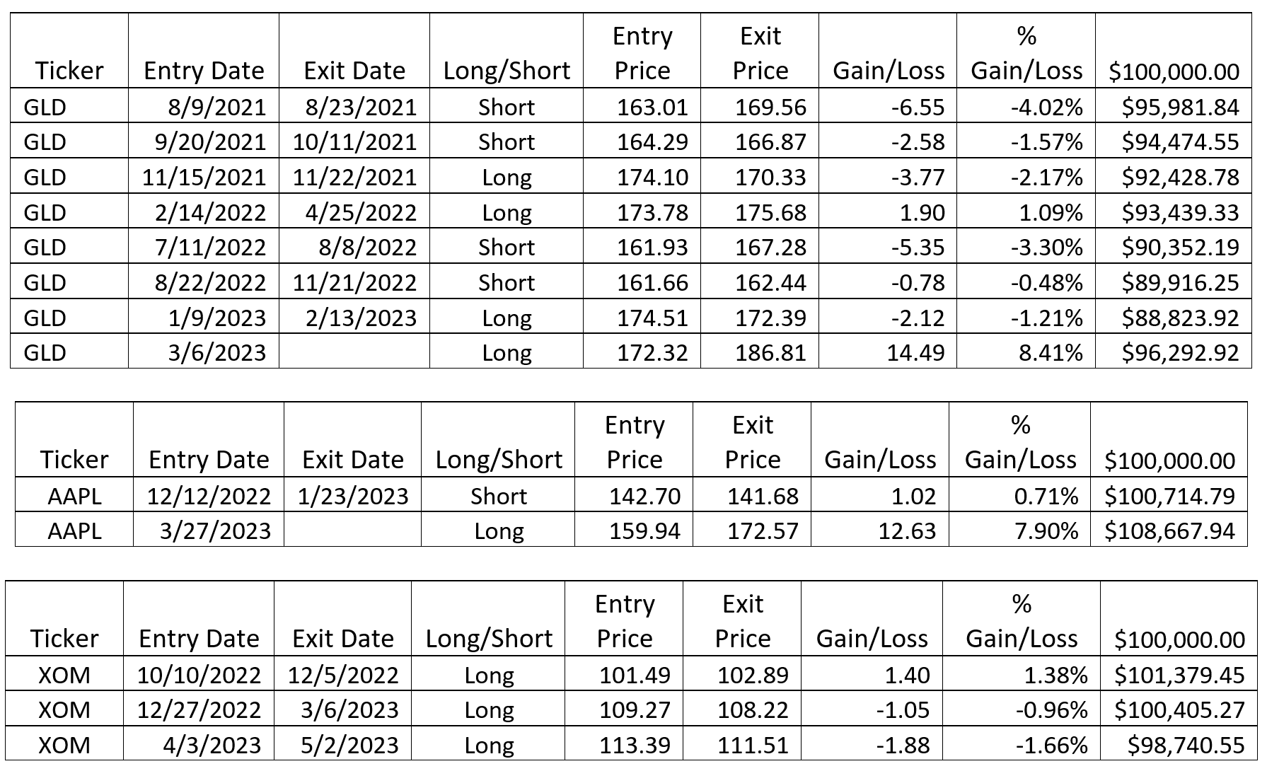 Results for GLD are not as good. The underlying ETF is up 14.6% while our method is down -3.7%. We have less than a one-year track record with AAPL and XOM. AAPL is up 20.9% while our system has a return of 8.6%. XOM is up 4% and the system is down -1.3%.
