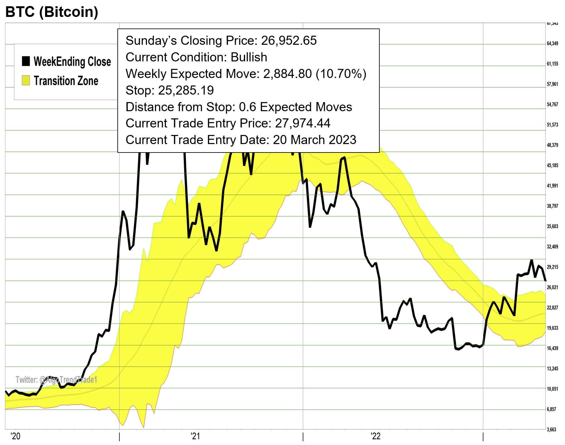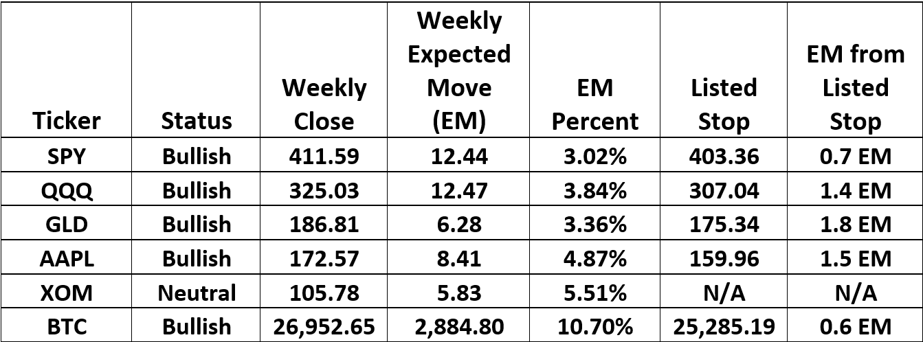 The markets were mostly lower this week, though QQQ did close higher. There were no changes in any of our current trades and no new trades were triggered. As always, the exits have been updated with the new stops. Be sure to check out the Expected Move on Bitcoin which dropped substantially this week.