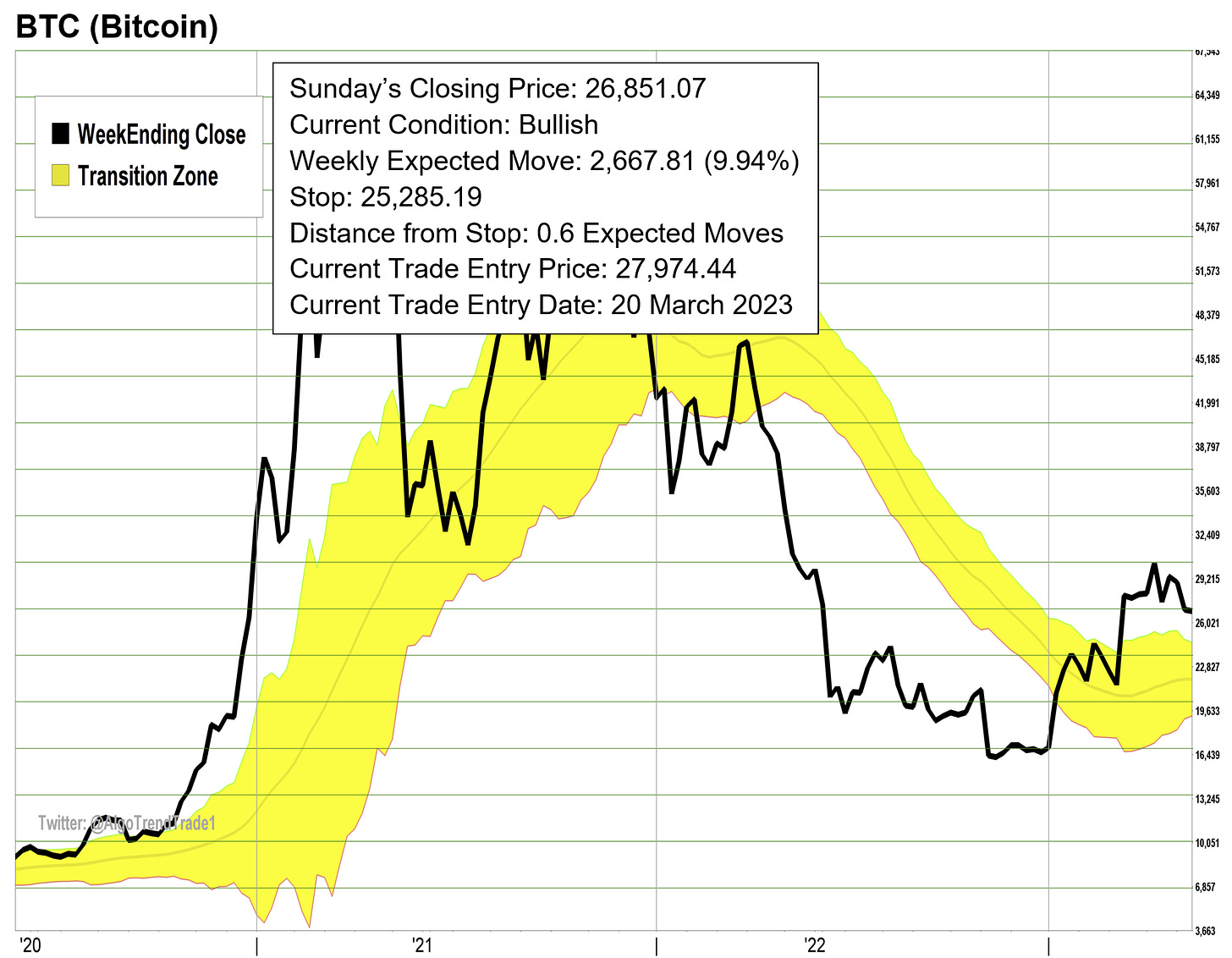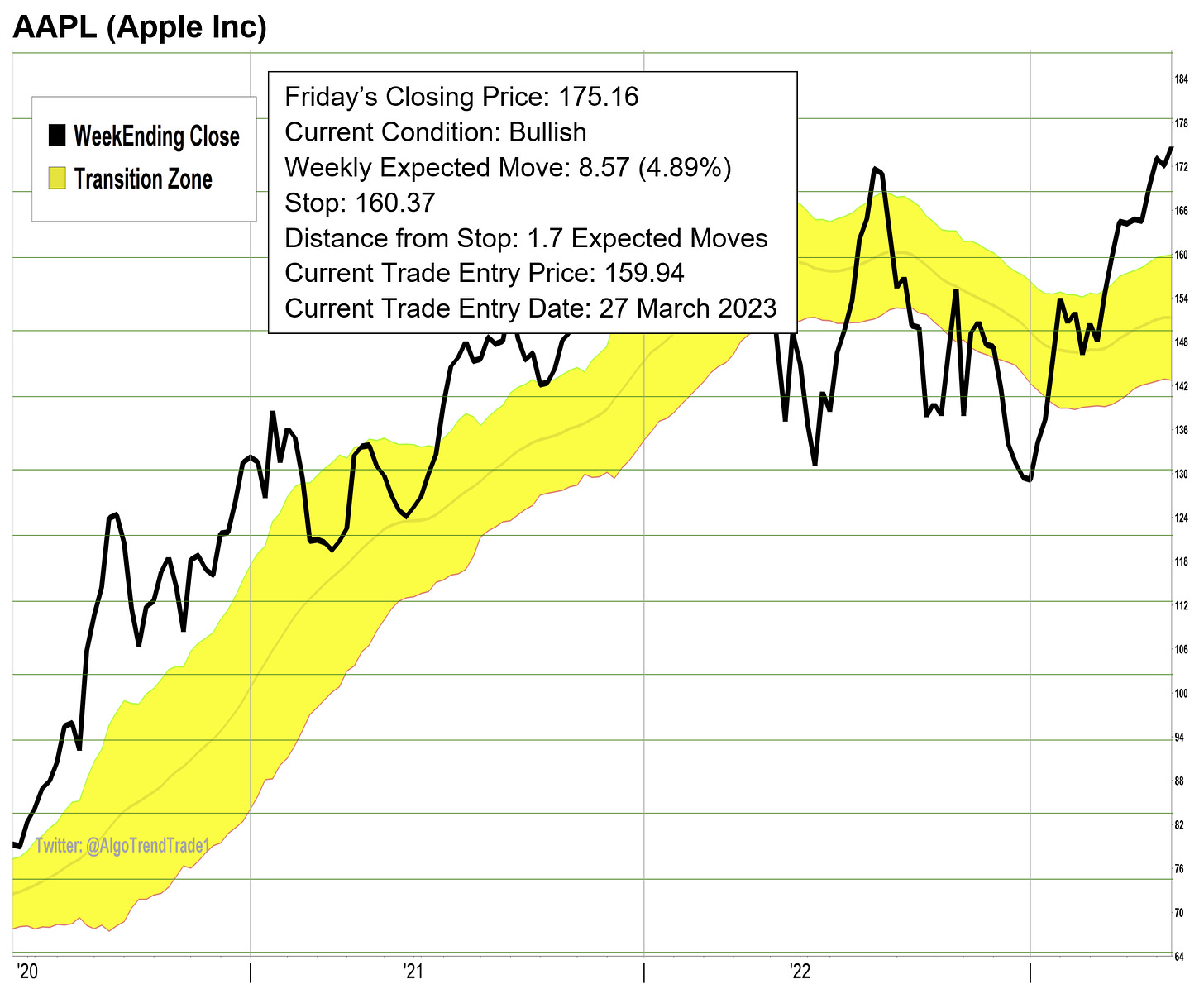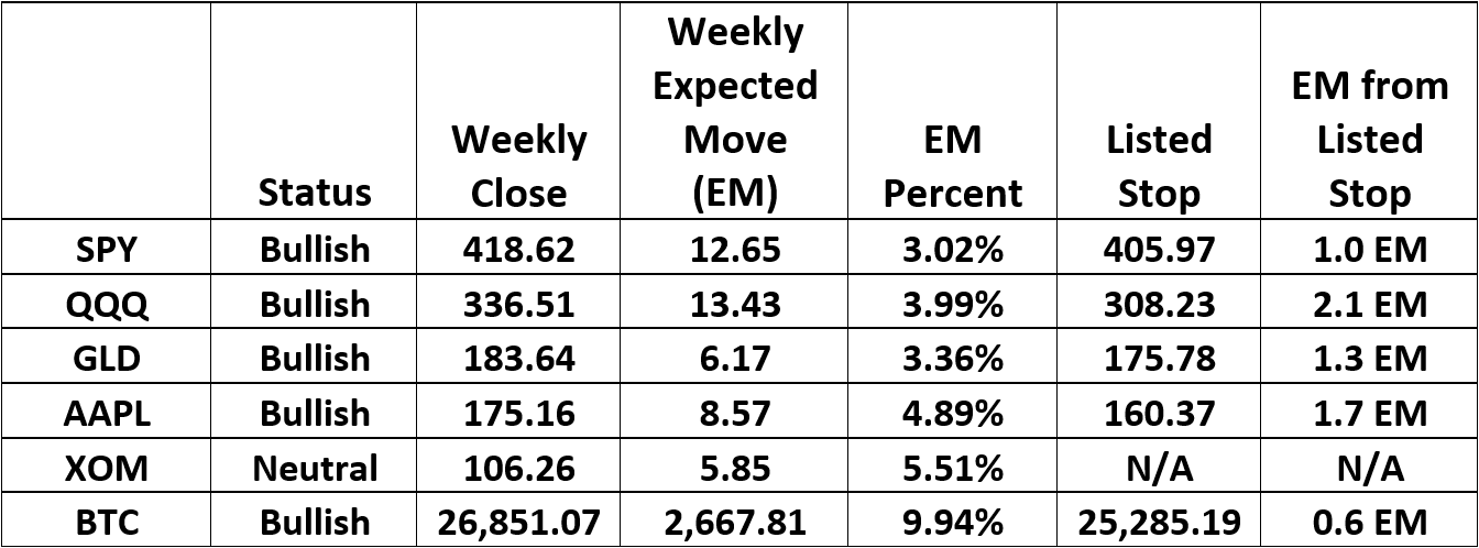 The markets were mostly higher last week and SPY, QQQ, and AAPL all closed up for the week. There were no changes in any of our current trades and no new trades were triggered. As always, the exits have been updated with the new stops. Be sure to check out the Expected Move on Bitcoin which dropped again this week and is now at the 10% level.