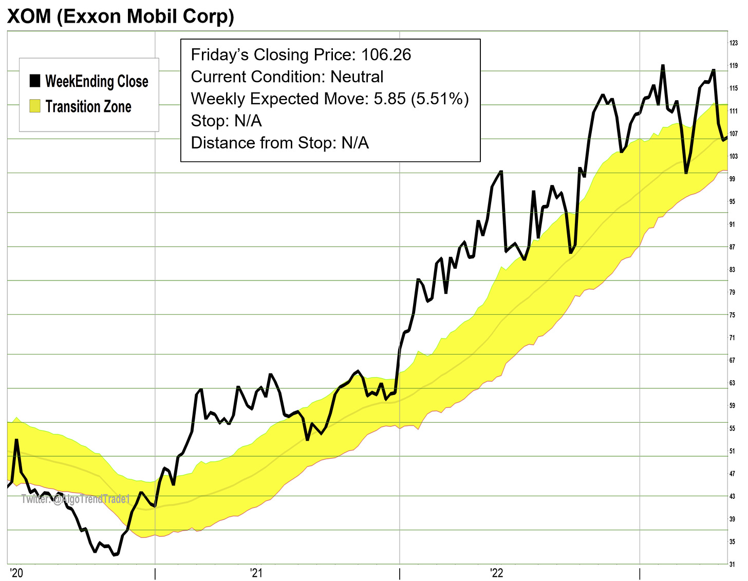 Every trade has a pre-determined exit strategy. This is based on the normal volatility of the underlying ticker. Each stock has its own unique volatility. And, volatility is dynamic. It’s constantly changing. Each week, we look at the previous 52 weeks of price movement to come up with its normal weekly volatility. This is called the “Expected Move”. The Expected Move equals one week of the normal volatility of the stock or ETF being measured. Every week, the exit strategy for each ticker is updated.