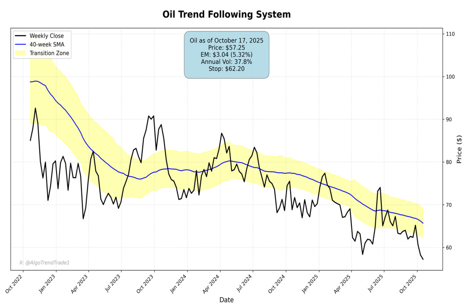 🛢️ Crude Continues Lower: Oil drops to $57.25, extending the bearish move. Short position now showing solid 6.36% profit with widening 1.6 EM distance from stop at $62.20. System discipline vindication continues.
