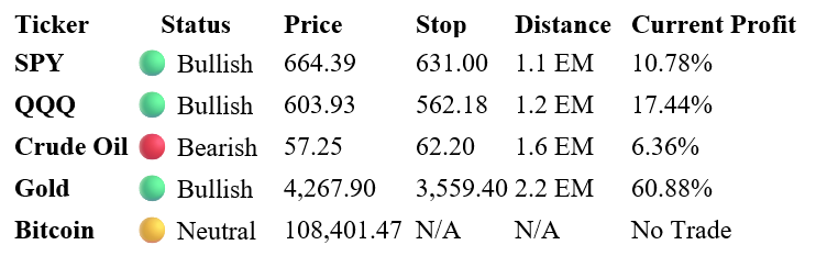 Major indices and gold surge to new all-time highs following last Friday’s sharp selloff. SPY closes at $664.39, QQQ at $603.93, and Gold rockets to $4,267.90 - all recovering strongly from last week’s weakness. Crude oil continues downward trend to $57.25, adding to short position profits. Bitcoin remains neutral with no trade following last week’s stop-out.