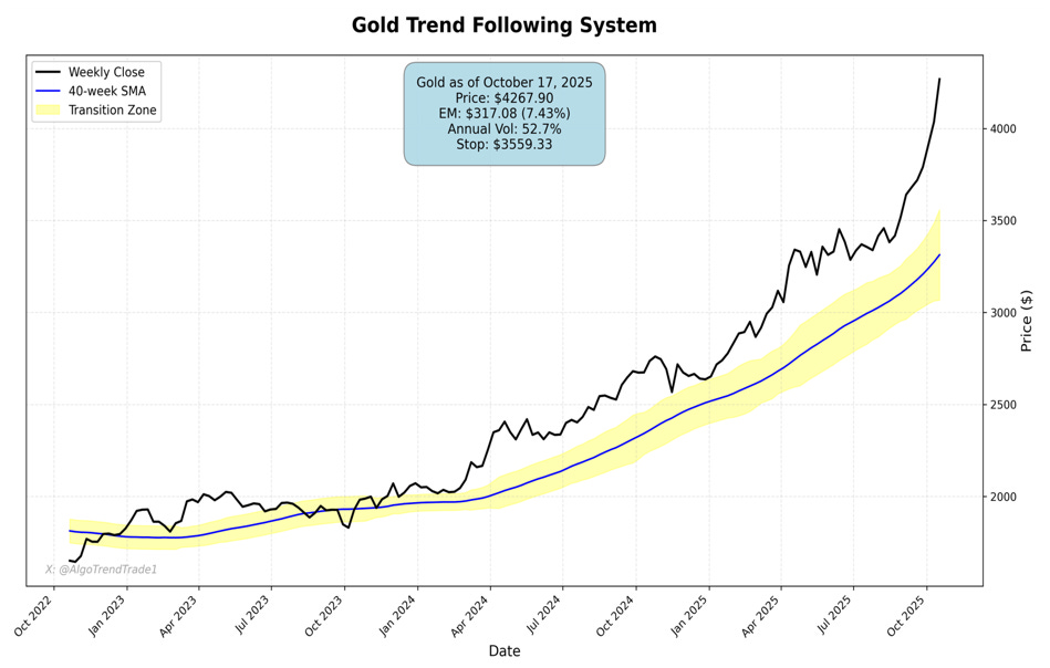 🥇 Gold Explosion: Spectacular surge to $4,267.90 - another new all-time high. Now showing remarkable 60.88% profit since January entry with 2.2 Expected Move cushion from stop. Distance from stop widens, providing excellent protection.