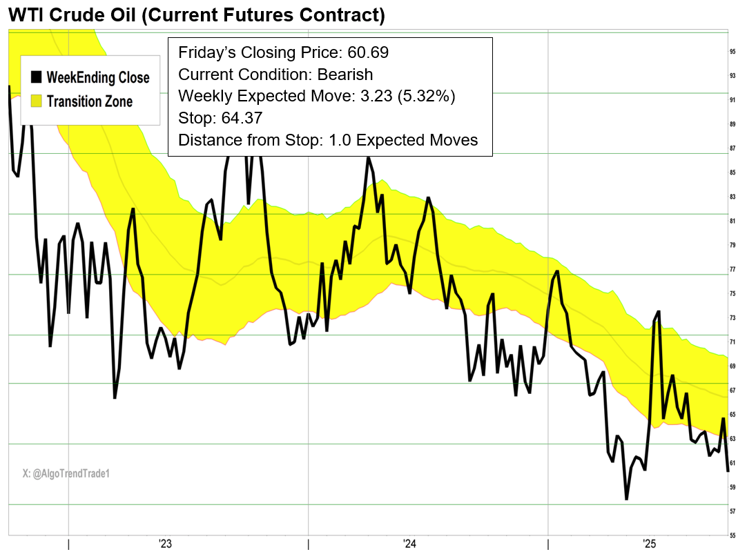 🛢️ Crude Oil Reversal: Price closed below yellow transition zone, triggering new bearish trade. Despite 3-year whipsaw pattern suggesting more frustration ahead, system discipline requires following the signal.