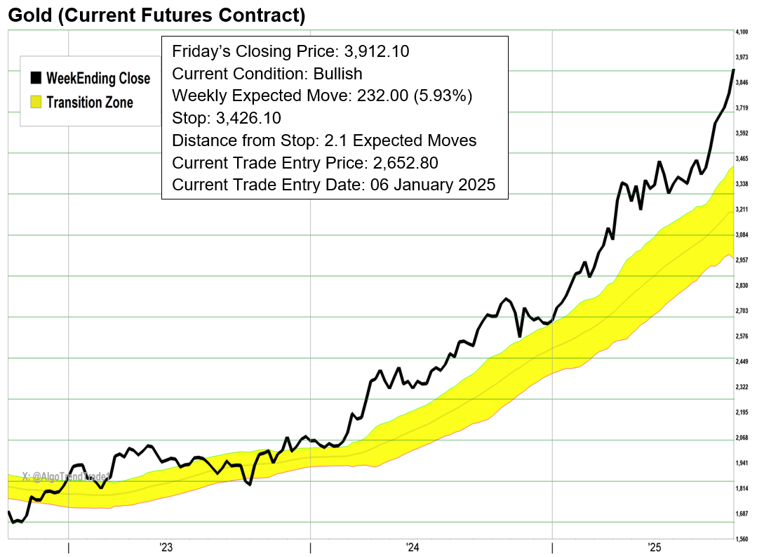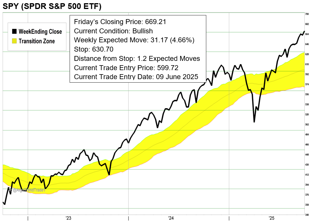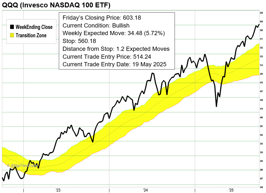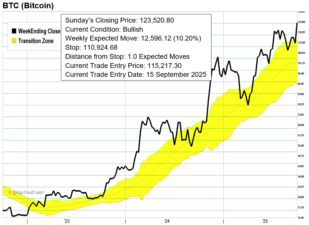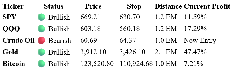 🚀 All-Time High Parade: Fresh records in SPY, QQQ, Gold, and Bitcoin. Expanded volatility pushed exits to more profitable positions across all four, with Bitcoin’s stop rising nearly $10,000.