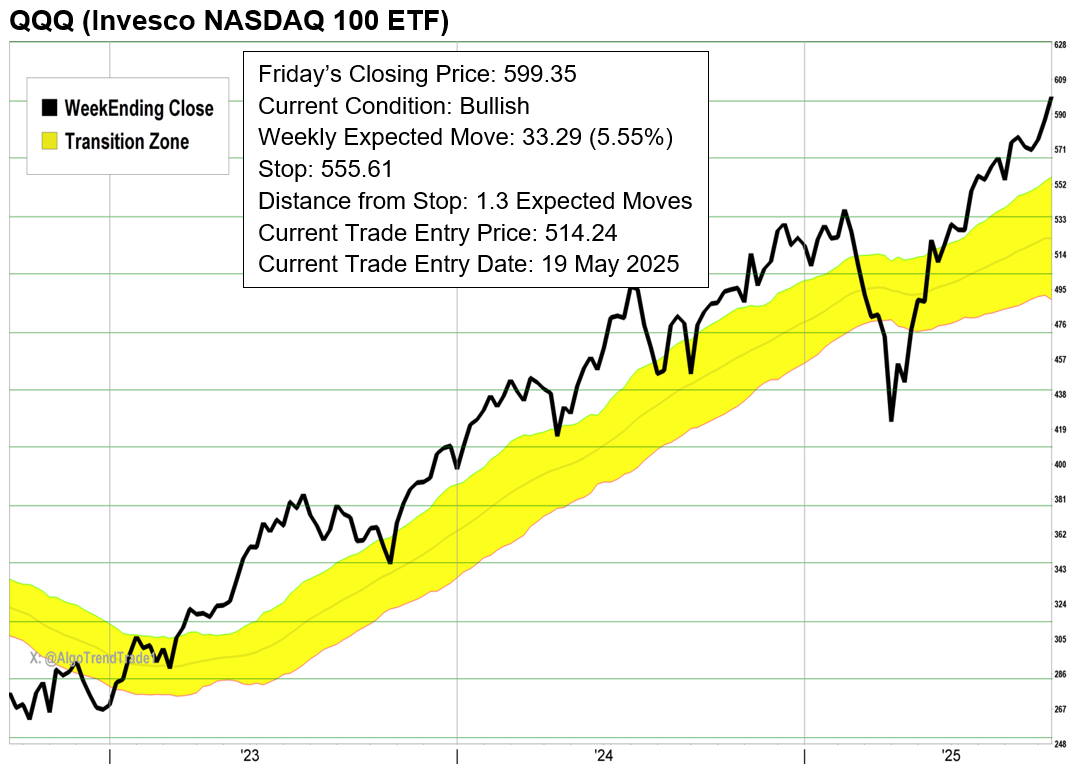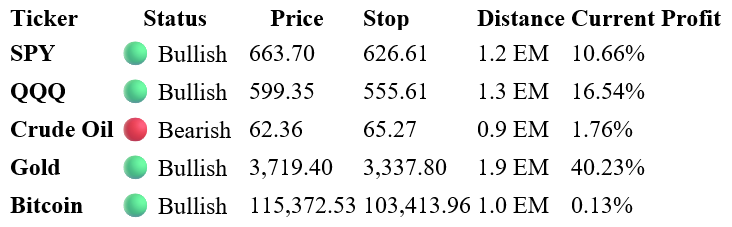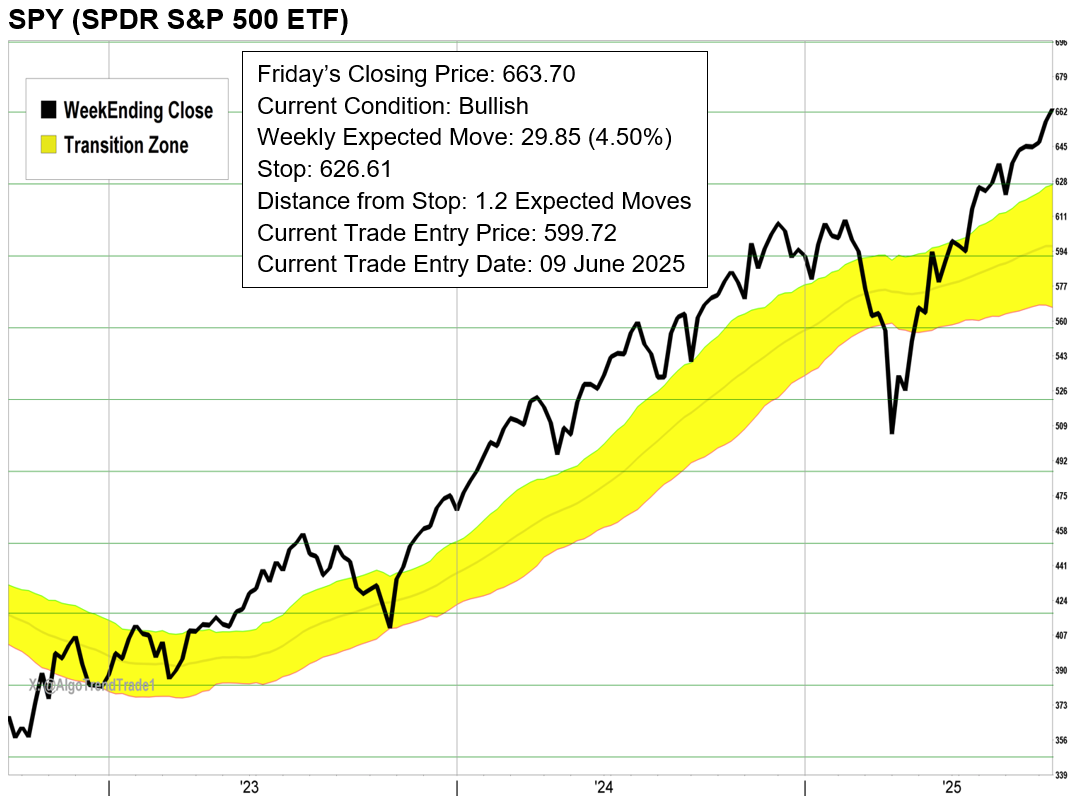 π Continued All-Time Highs: SPY and QQQ extend their remarkable runs with fresh records, building larger profit cushions as stops move higher.