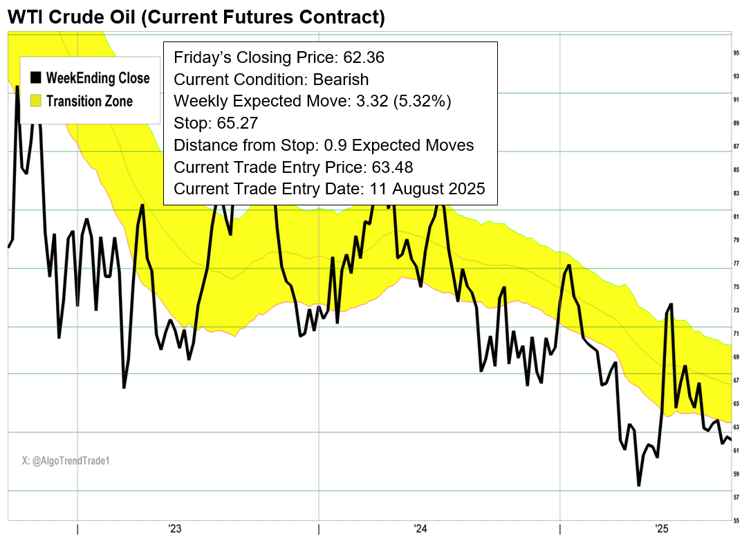 π’οΈ Crude Oil Weakness: Bearish position showing small gain as price remains below transition zone.