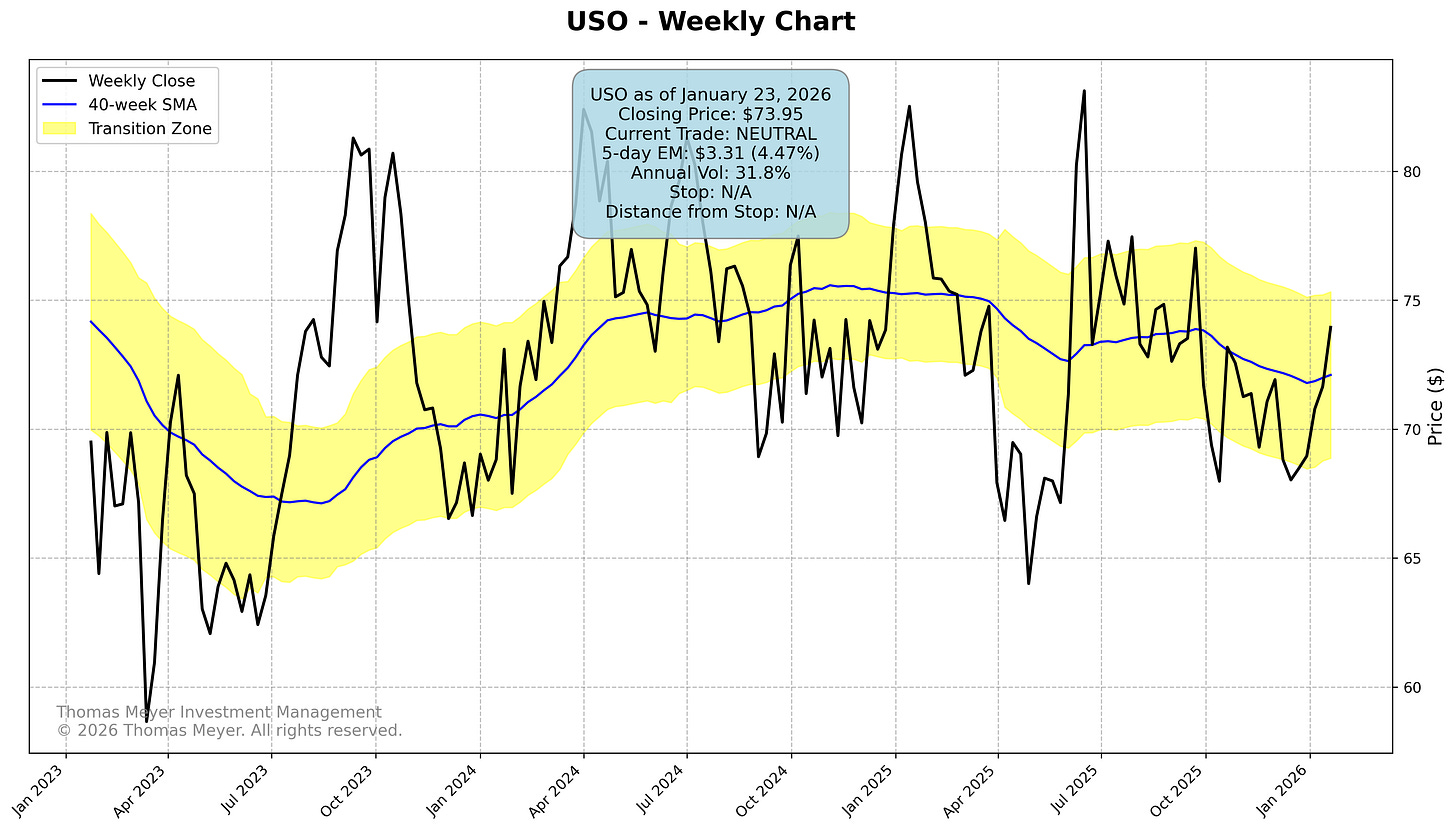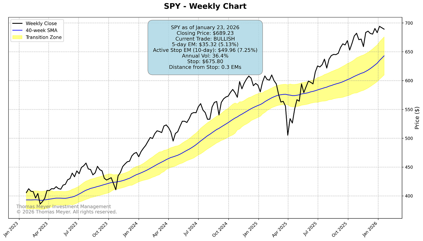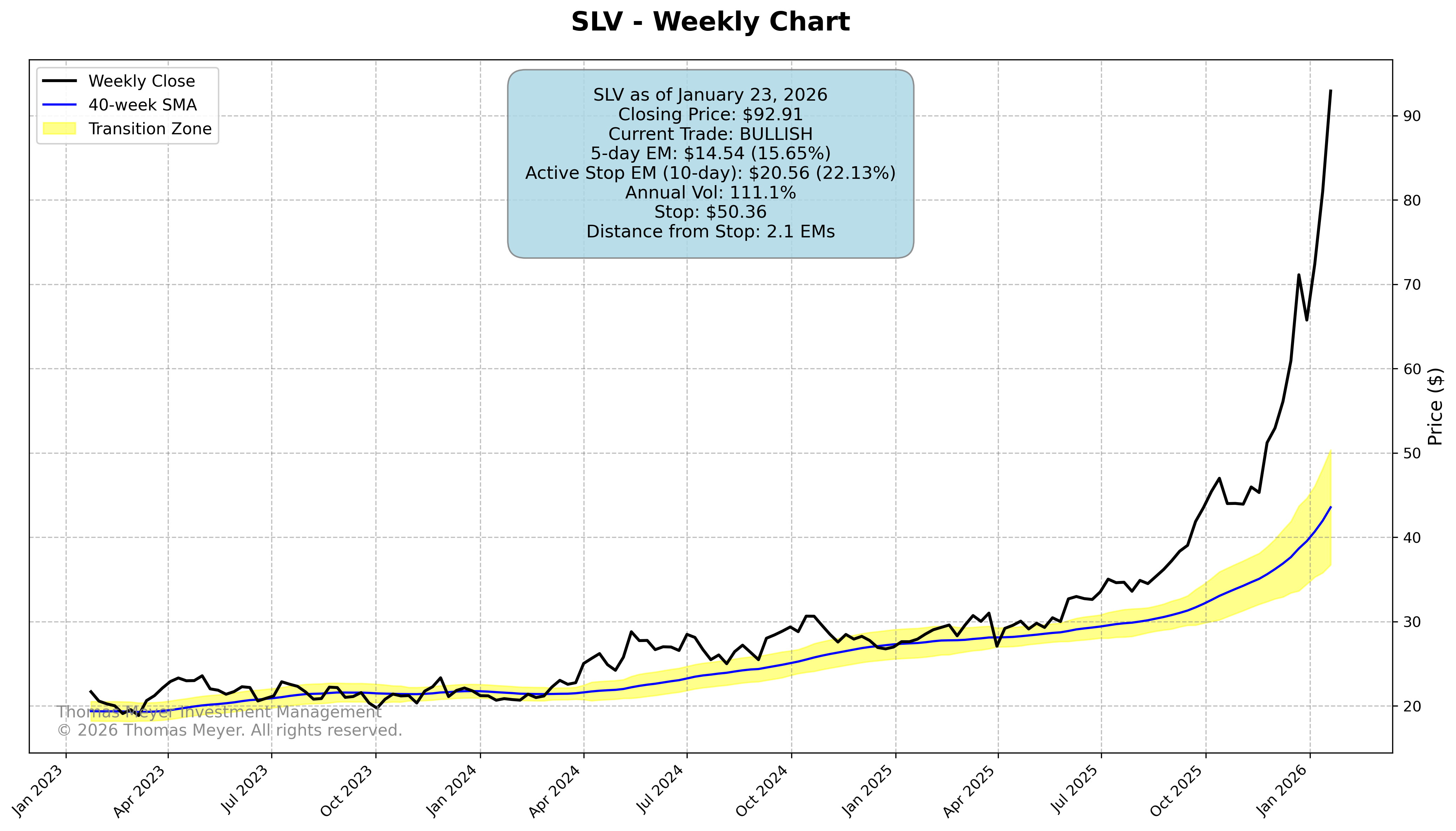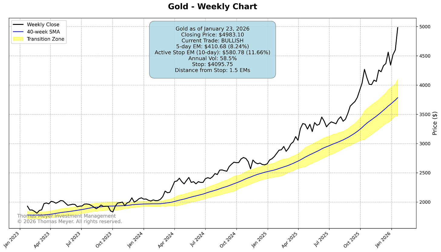 Gold continues its spectacular run, now pushing toward $5,000 and sitting 1.5 Expected Moves from the stop. That’s 88% profit since we entered in January 2025—this is what trend-following is designed to capture.
