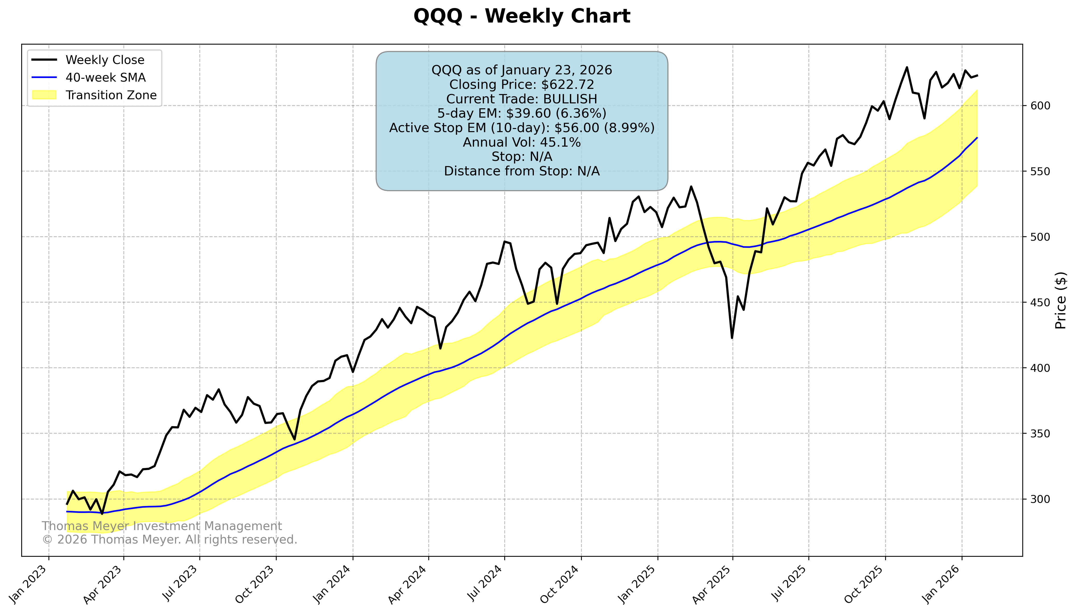We stopped out of our QQQ trade last week by a penny! Ugh, that’s painful. Of course, the pain is knowing that last week’s exit was the actual weekly bottom and QQQ has moved higher since then. But, that’s the nature of trading. The trade lasted over 8 months, and we netted a gain of a little over 18%. That’s a really strong result!