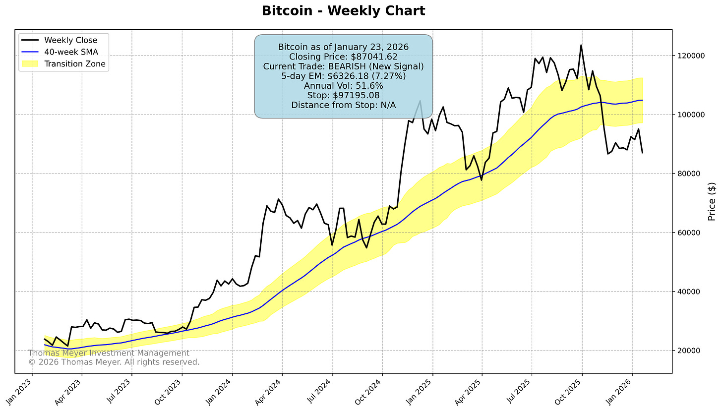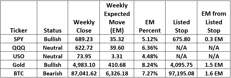 SPY closed slightly lower this week but remains bullish—though it’s getting uncomfortably close to the exit at just 0.3 Expected Moves away. QQQ bounced back after stopping us out last week by a penny (yes, that still stings), but our cooldown rule keeps us on the sidelines for one more week. Sometimes the most disciplined thing you can do is nothing. Bitcoin triggered a fresh bearish trade after satisfying its cooldown period.
