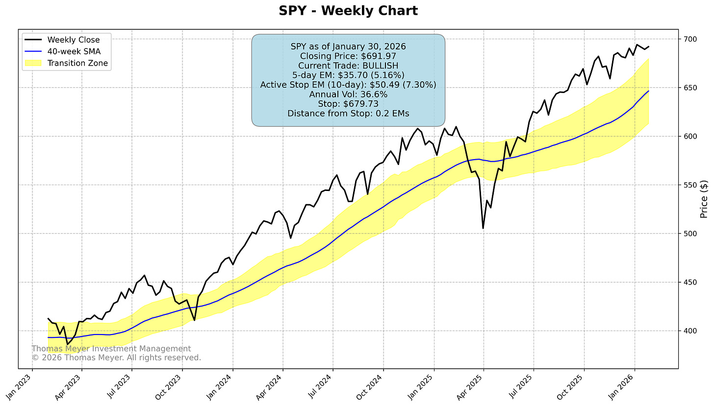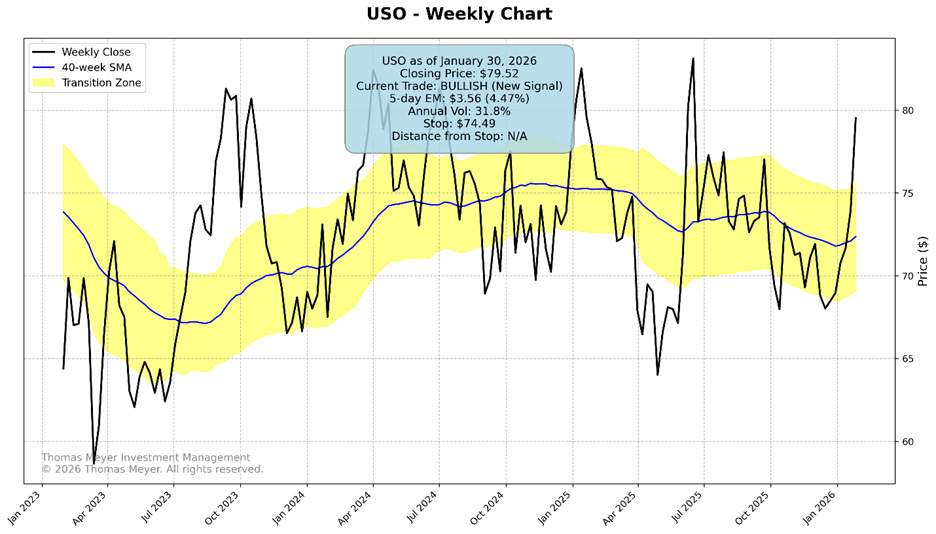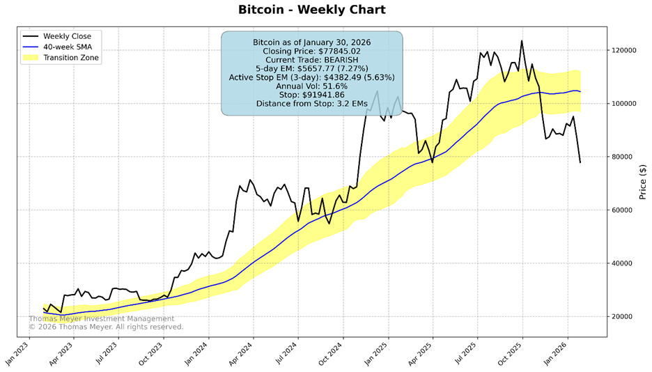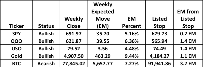 As I write this, futures are sharply lower. SPY is just $4 from its exit, which would lock in over 13% profit from a 7-month trade. Both new bullish trades that triggered Friday (QQQ and USO) are likely to be cancelled at Monday’s open based on current overnight levels. Bitcoin’s bearish trade is working beautifully—down nearly $3,000 and approaching 3.2 Expected Moves from the stop.