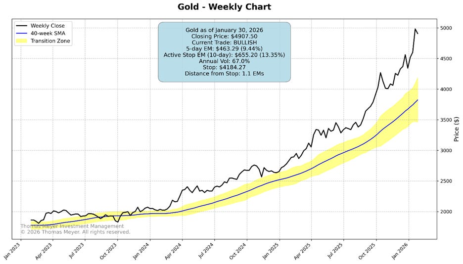 Gold pulled back from its highs but remains solidly bullish at 1.1 Expected Moves from the stop, still up 85% since January 2025.