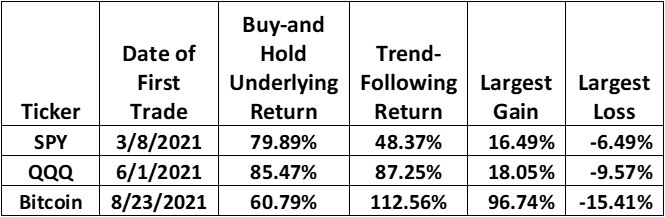 The trend-following approach I use has a decade-long track record across multiple newsletters in three countries. Here are the results for SPY, QQQ, and Bitcoin since I started publishing on Substack:
